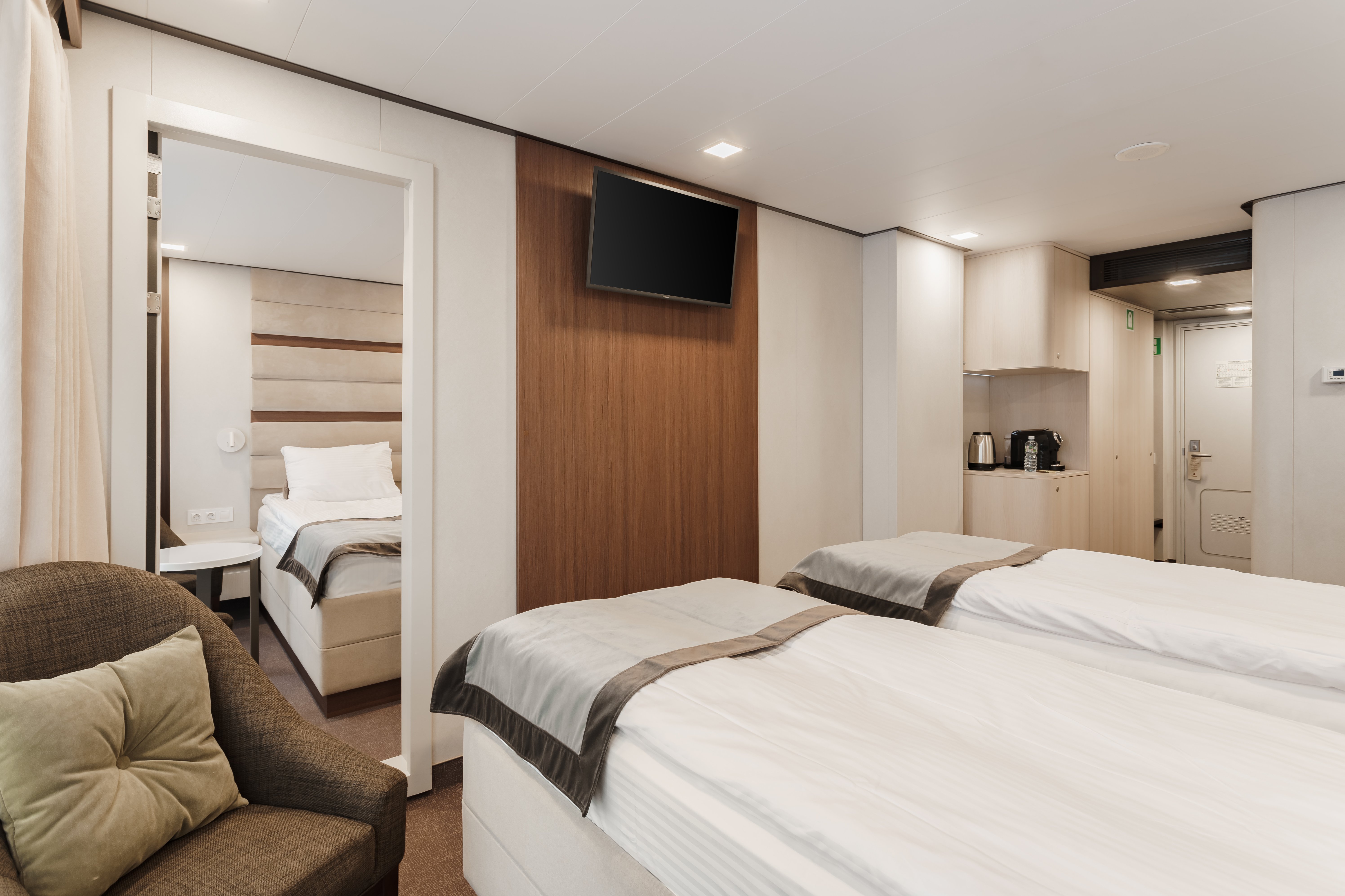| Средняя палуба | Двухместная Комфортабельная одноярусная каюта, рассчитанная на двух человек В каюте: две односпальные кровати (сдвигаются), панорамное окно, спутниковое ТВ, шкаф для одежды, холодильник, кондиционер, розетки 220V, телефон, радио, фен, сейф, капсульная кофемашина, электрочайник, душ, санузел. Площадь — 19 кв.м. | 2-местное размещение | нет |