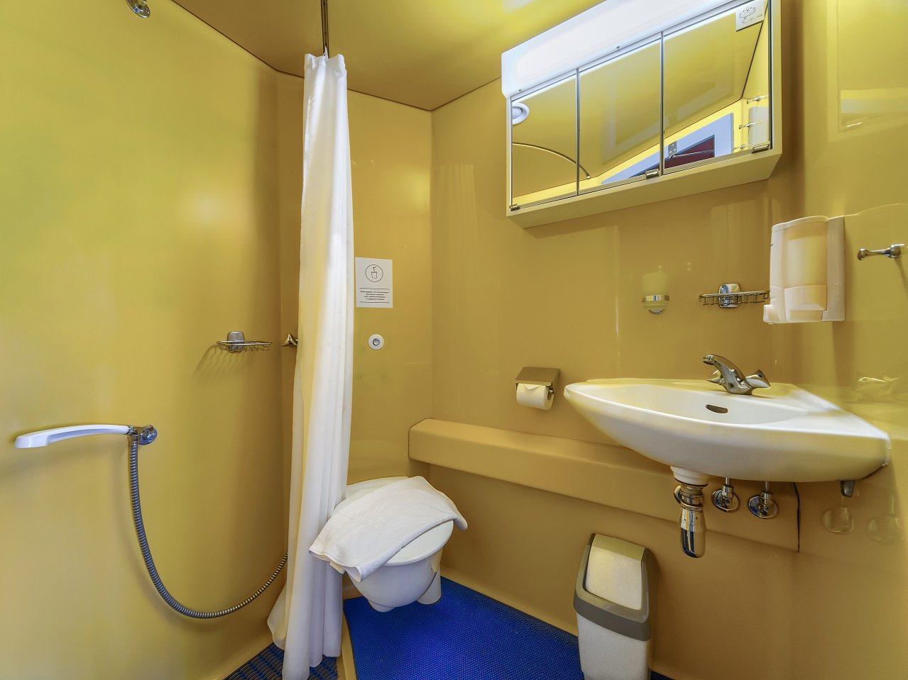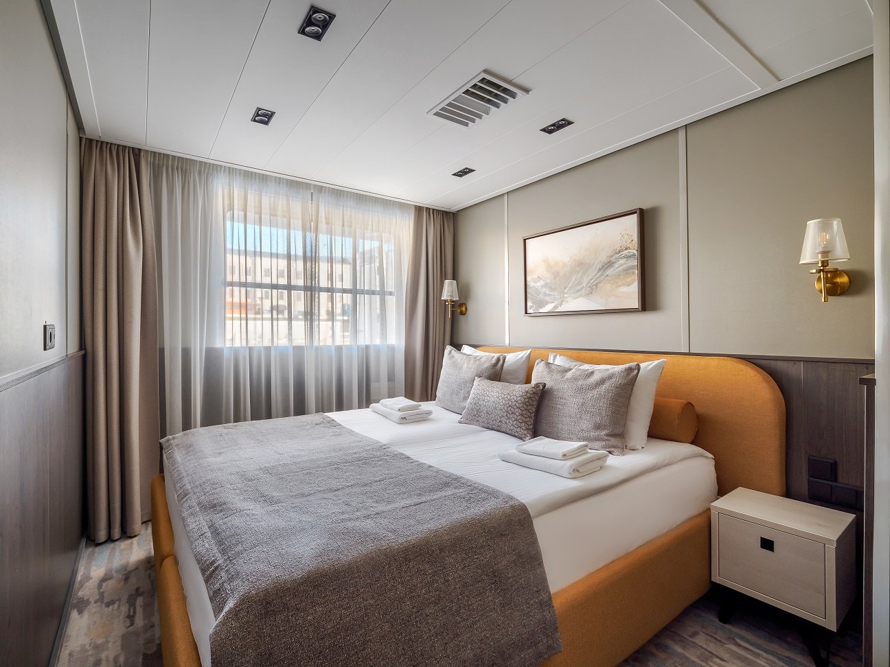 | Средняя палуба | Двухместная одноярусная Однокомнатная одноярусная каюта, рассчитанная на размещение двух человек, площадь каюты до 7,9 кв.м. В каюте: два спальных места (не сдвигаются), шкаф для одежды, радио, кондиционер, телевизор, холодильник, фен, сейф, душ, санузел, обзорное окно, электророзетка на 220V.Размер кроватей 80х195 см | 2-местное размещение | ✔ |