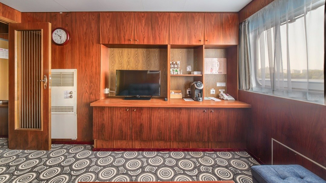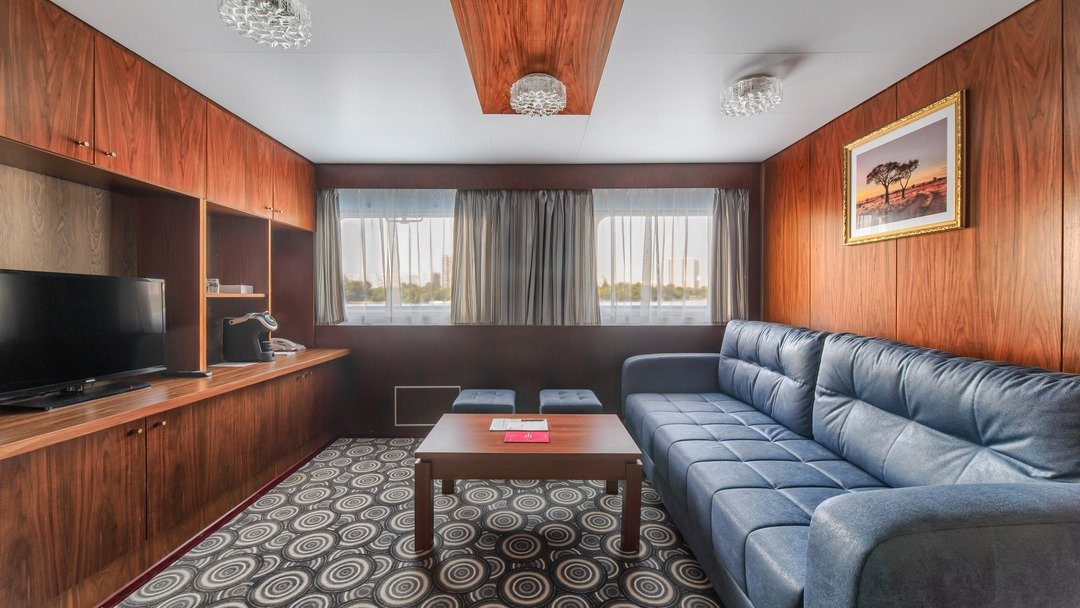 Шлюпочная палуба | Люкс двухместный Двухкомнатная каюта с удобствами, рассчитаная на размещение от двух до трёх человек Двухкомнатная каюта с удобствами (душ, санузел, кондиционер). Каюта рассчитана на размещение двух человек ( возможно добавить два дополнительных платных места). В гостиной: мягкая мебель (диван), шкафы для одежды, телевизор, холодильник, радио, мини-кухня, два обзорных окна, электророзетка на 220V. В спальне: двуспальная кровать, обзорное окно. Дополнительные привилегии для гостей кают класса «Люкс»: — капсульная кофемашина – 1 капсула в день на человека (по количеству гостей в каюте); — игристое вино (1 бутылка на каюту) в день посадки, без пополнения, только в рейсах от 5 дней; — чайный набор в рейсах любой продолжительности (ежедневное пополнение).Площадь каюты - 26,87 кв.м. (спальня - 9,66 кв.м, гостиная - 17, 21 кв.м.). | 2-местное размещение | нет |