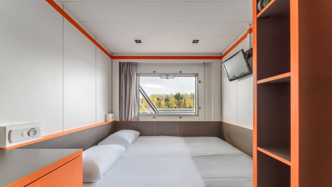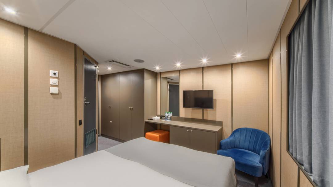 | Шлюпочная палуба | 2-местная с двуспальной кроватью Однокомнатная каюта с удобствами, рассчитанная на размещение двух человек В каюте: двуспальная кровать, холодильник, телевизор, шкаф для одежды, радио, сейф, обзорное окно, душ, санузел, кондиционер, фен, электророзетка на 220V.В каютах 413, 415-418 (шлюпочная палуба), 335-338 (средняя палуба) — двуспальная кровать размером 160х200 см, площадь каюты 10 м2 | 2-местное размещение | нет |