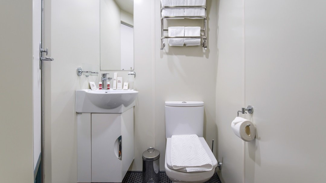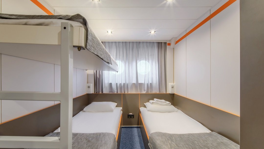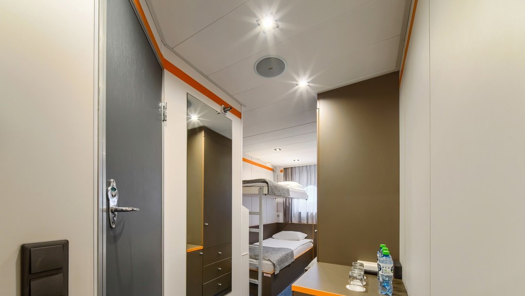| Нижняя палуба | Трехместная двухъярусная Однокомнатная одноярусная каюта с удобствами, рассчитанная на размещение до трех человек В каюте три спальных места, шкаф для одежды, холодильник, телевизор, радио, сейф, душ, санузел, кондиционер, фен, два иллюминатора, электророзетка на 220V.Возможна продажа каюты в двухместном одноярусном размещении (по стоимости 2-местной каюты).Площадь каюты 11 м2Размер кроватей 80х180 см | 2-местное размещение | ✔ |