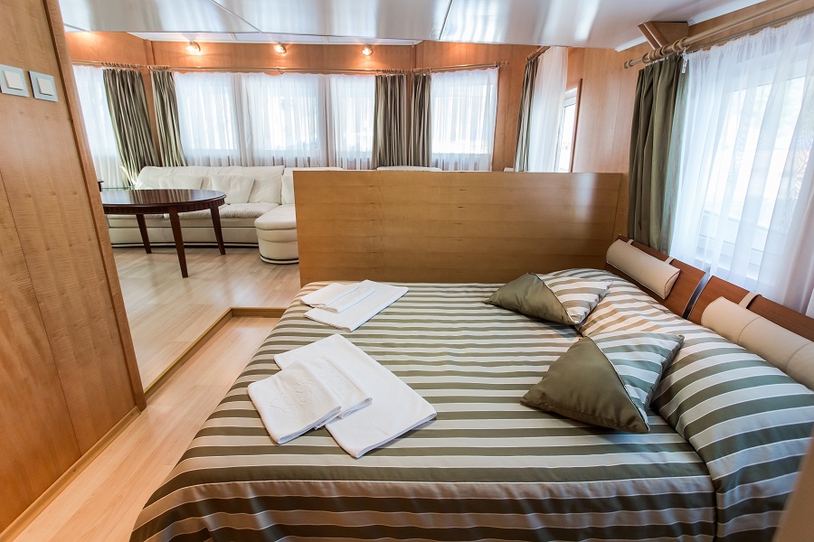 Верхняя палуба | Люкс (верхняя палуба) К категории Люкс относятся каюты: 401, 403. Двухместная каюта повышенной комфортности со всеми удобствами, расположенная на верхней палубе.Площадь каюты ≈ 22 м². Размер кровати – 160х200 см. Возможно размещение ребенка до 10 лет на дополнительном спальном месте (диван, не раскладывается). Вход и выход из каюты осуществляется с палубы. В каюте: двуспальная кровать, две прикроватные тумбочки, шкаф для одежды, диван, кресло, тумба под ТВ, телевизор, DVD, ванная комната (джакузи, раковина, туалет), фен, розетки 220V, телефон (звонки по теплоходу), обогреватель, кондиционер, мини-бар, обзорные окна. | 2-местное размещение | нет |