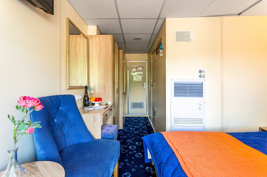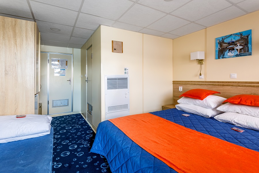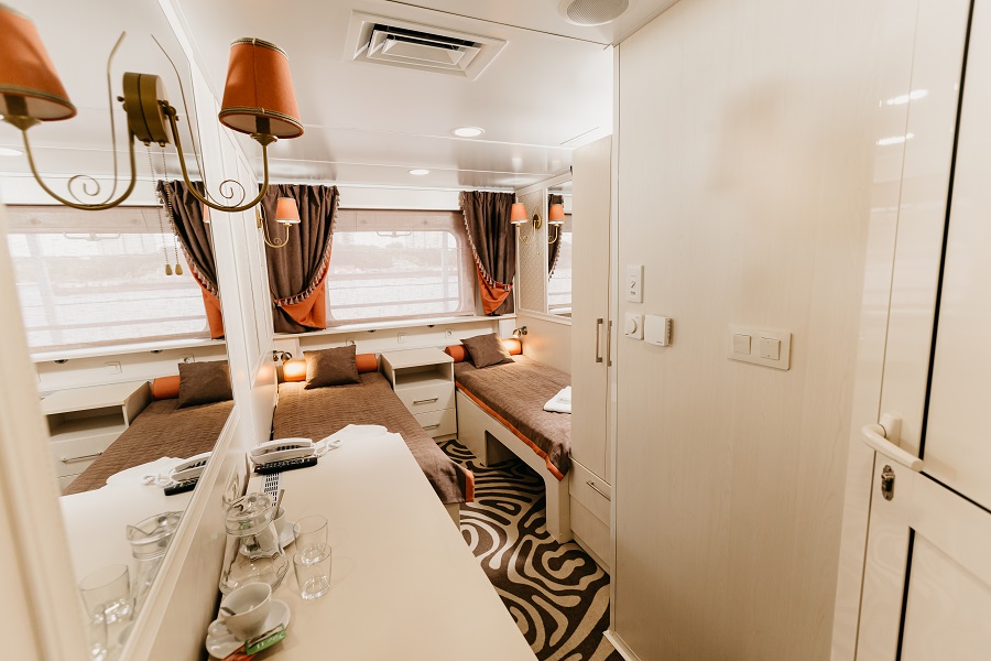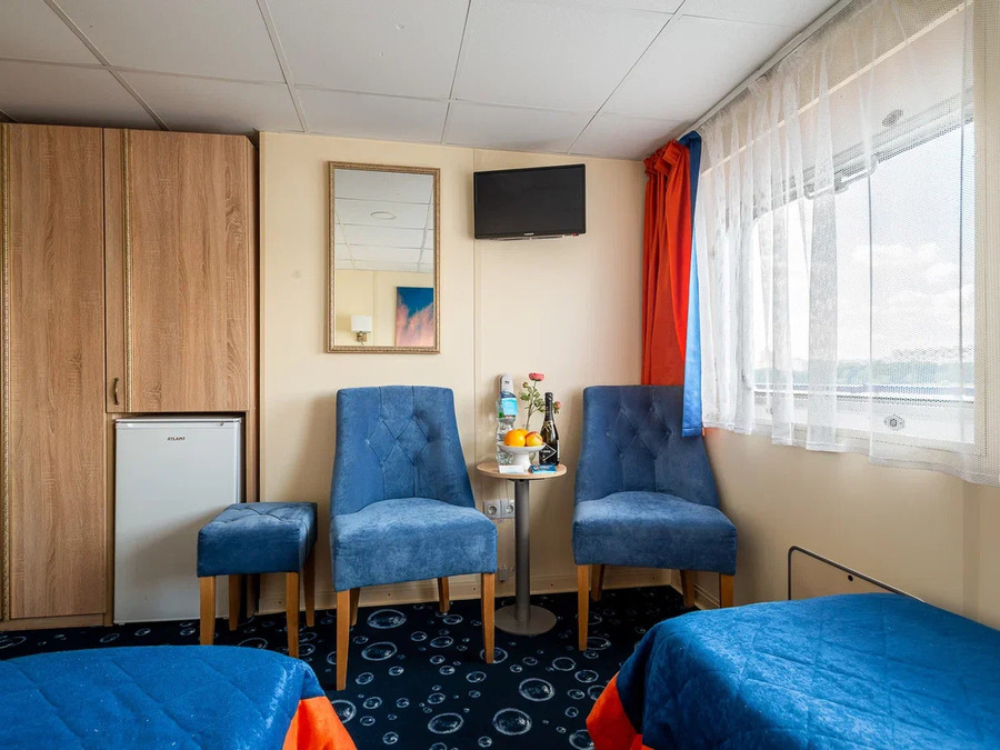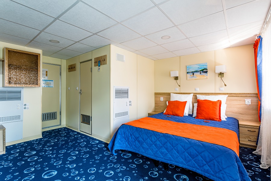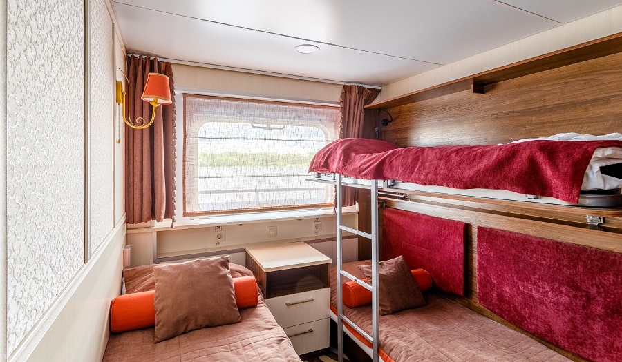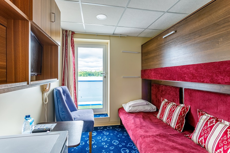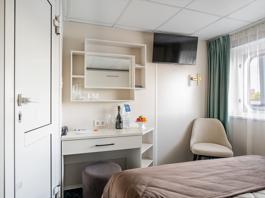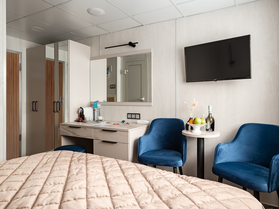 Главная палуба | ПК-С НОВИНКА 2025К категории ПК-С относятся каюты: 201, 202, 207–209, 212, 215, 217, 218, 220, 221.Двухместная каюта увеличенной площади со всеми удобствами, расположенная на главной палубе. Площадь каюты 12,2 м². Возможно размещение третьего человека на дополнительном месте – верхняя полка. Размер дополнительного места: 190 см длина и 75 см ширина. Размещение ребенка до 5 лет без места и питания, при наличии свободного дополнительного места, производится только по согласованию с судоходной компанией. В каютах 207 и 217 кровати не раздвигаются. В каюте: одна двуспальная кровать (при необходимости трансформируется в две односпальные), верхняя полка, ванная комната (раковина, душевая кабина, туалет), шкаф, тумба, пуф, кресло, стол, настенная полка, кондиционер, телевизор с кабельным и спутниковым вещанием, холодильник, телефон внутренней связи, фен, плед для каждого туриста, розетки 220 V, одно панорамное окно. Также к услугам гостей: косметика для душа, туалетные принадлежности, мини-бар (за дополнительную плату), щетка для одежды, банные халаты, маски для сна, тапочки, набор посуды и столовых приборов, питьевая вода, чайная пара, «приветственный набор» (игристый напиток, фрукты), капсульная кофемашина (одна чашка кофе на человека – в подарок). | 2-местное размещение | ✔ |