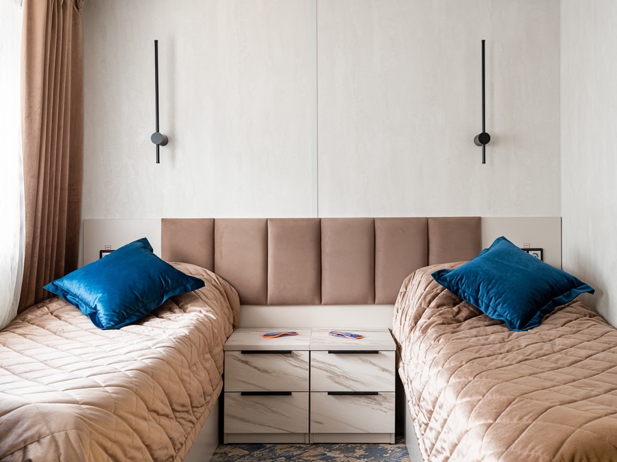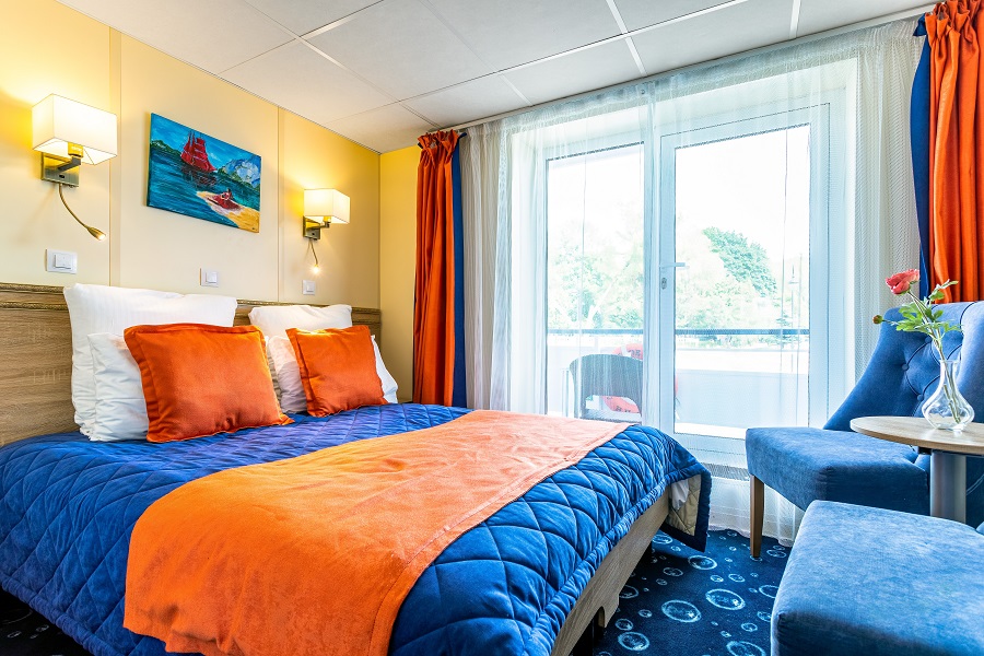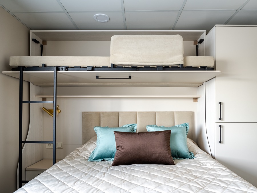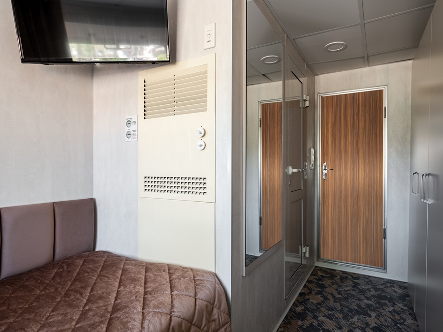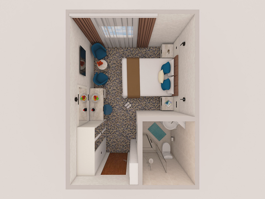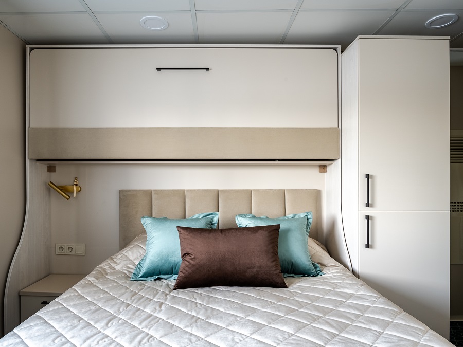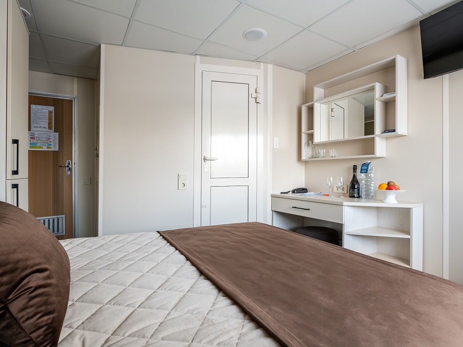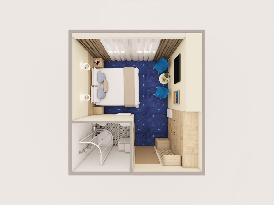Главная палуба | ПК-С НОВИНКА 2025К категории ПК-С относятся каюты: 201, 202, 207–209, 212, 215, 217, 218, 220, 221.Двухместная каюта увеличенной площади со всеми удобствами, расположенная на главной палубе. Площадь каюты 12,2 м². Возможно размещение третьего человека на дополнительном месте – верхняя полка. Размер дополнительного места: 190 см длина и 75 см ширина. Размещение ребенка до 5 лет без места и питания, при наличии свободного дополнительного места, производится только по согласованию с судоходной компанией. В каютах 207 и 217 кровати не раздвигаются. В каюте: одна двуспальная кровать (при необходимости трансформируется в две односпальные), верхняя полка, ванная комната (раковина, душевая кабина, туалет), шкаф, тумба, пуф, кресло, стол, настенная полка, кондиционер, телевизор с кабельным и спутниковым вещанием, холодильник, телефон внутренней связи, фен, плед для каждого туриста, розетки 220 V, одно панорамное окно. Также к услугам гостей: косметика для душа, туалетные принадлежности, мини-бар (за дополнительную плату), щетка для одежды, банные халаты, маски для сна, тапочки, набор посуды и столовых приборов, питьевая вода, чайная пара, «приветственный набор» (игристый напиток, фрукты), капсульная кофемашина (одна чашка кофе на человека – в подарок). | 2-местное размещение | ✔ |