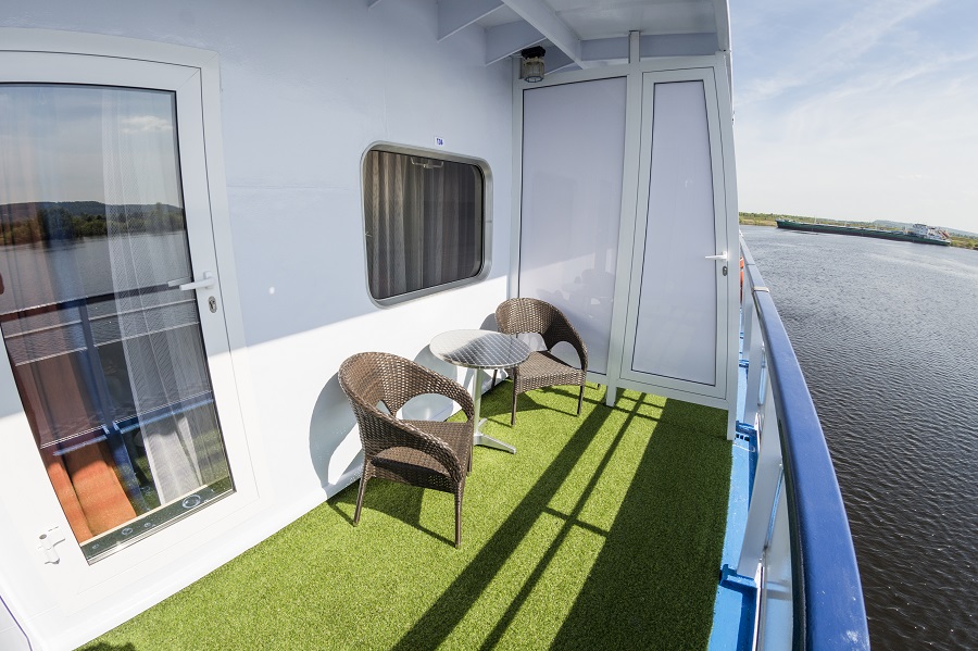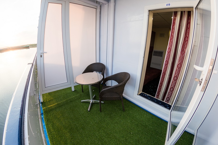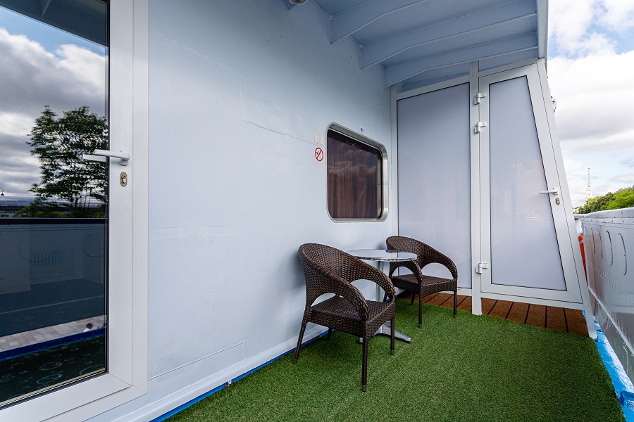 Шлюпочная палуба | Полулюкс с балконом Б К категории Полулюкс с балконом Б относятся каюты: 403–406, 411, 412, 417, 418. Каюты данной категории носят имена: № 403 – «Михаил Фокин» № 411 – «Екатерина Максимова» № 404 – «Матильда Кшесинская» № 412 – «Ольга Лепешинская» № 405 – «Вацлав Нижинский» № 417 – «Алла Шелест» № 406 – «Екатерина Вазем» № 418 – «Наталья Дудинская» Двухместные каюты увеличенной площади со всеми удобствами, расположенные на шлюпочной палубе. Площадь каюты ≈ 20,6 м² (включая балкон ≈ 6,8 м²).В каюте: одна двуспальная кровать (при необходимости трансформируется в две односпальные кровати), ванная комната (раковина, душевая кабина, туалет), два кресла, прикроватные тумбы, шкаф, кофейный столик, туалетный стол, пуф, вешалка для верхней одежды, холодильник, кондиционер, радио, фен, плед для каждого туриста, телевизор с кабельным и спутниковым вещанием, сейф, телефон, розетки 220 V, панорамное окно, стеклянная балконная дверь, персональный балкон с мебелью для отдыха.Также к услугам туристов в каюте: косметика для душа, туалетные принадлежности, щетка для одежды, банные халаты, маски для сна, тапочки, набор посуды и столовых приборов, чайная пара, питьевая вода и «приветственный набор» (игристый напиток, фрукты), мини-бар (за дополнительную плату), капсульная кофемашина (одна чашка кофе на человека – в подарок). | 2-местное размещение | ✔ |