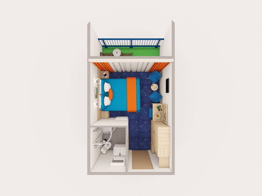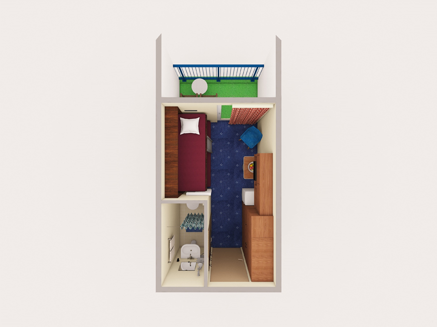 Шлюпочная палуба | А1+ с балконом К категории А1+ с балконом относятся каюты: 409, 410, 419, 420. Одноместная каюта с балконом со всеми удобствами, расположенная на шлюпочной палубе. Площадь каюты ≈ 14,4 м² (включая балкон ≈ 4,8 м²). Возможно размещение второго человека на дополнительном месте – откидная полка. В каюте: односпальная кровать, дополнительное спальное место верхнего расположения (откидная полка), ванная комната (раковина, душ, туалет), кресло, туалетный стол, шкаф, зеркало, холодильник, радио, кондиционер, фен, плед для каждого туриста, телевизор с кабельным и спутниковым вещанием, розетки 220 V, щетка для одежды, стеклянная балконная дверь-окно, персональный балкон с мебелью для отдыха. | 1-местное размещение | ✔ |