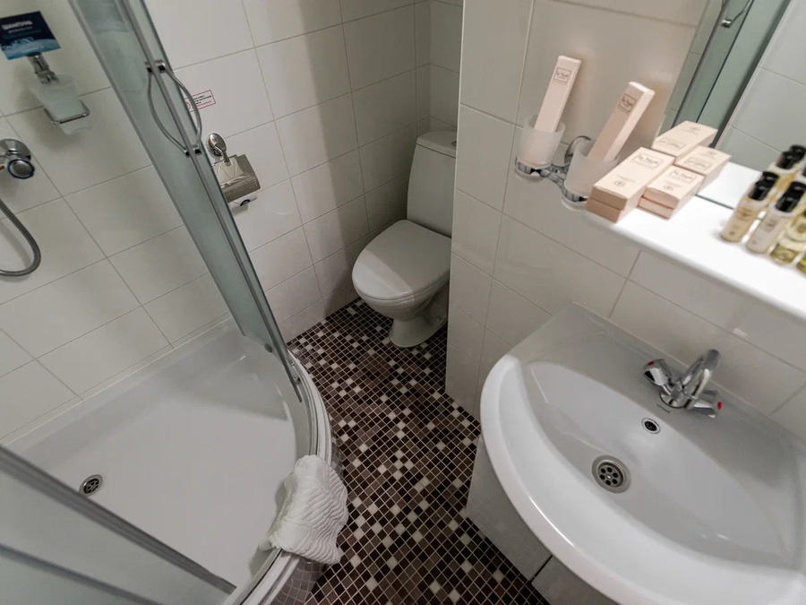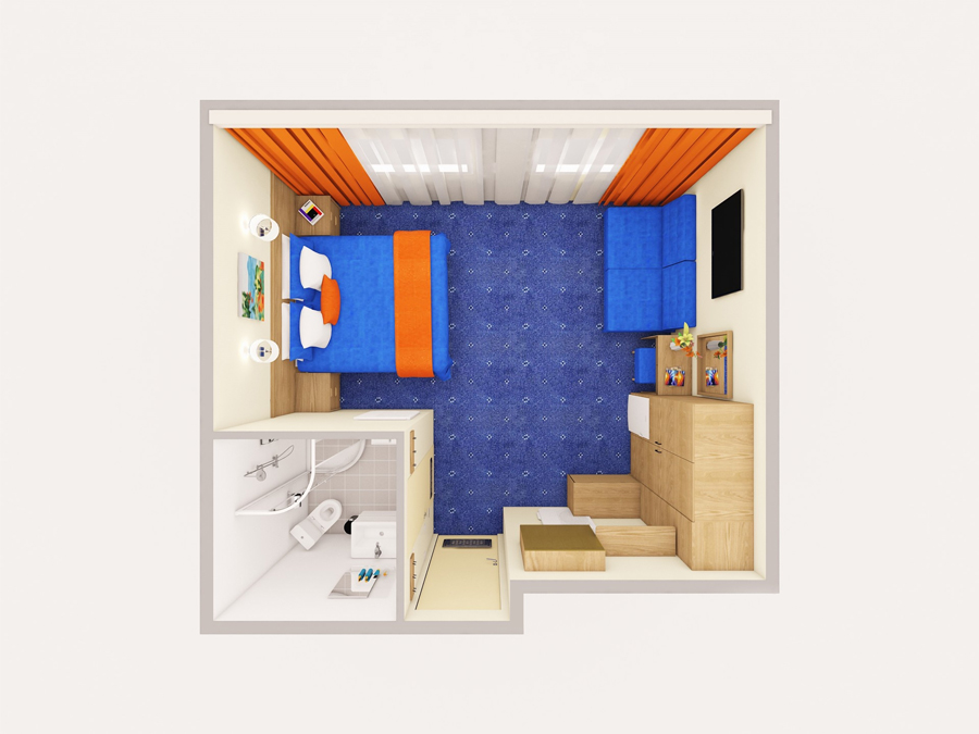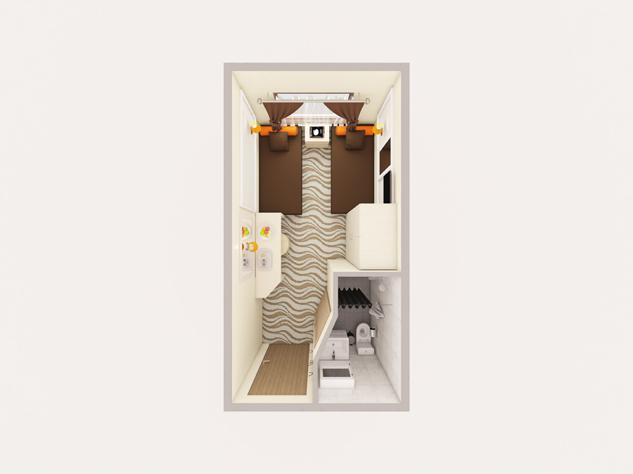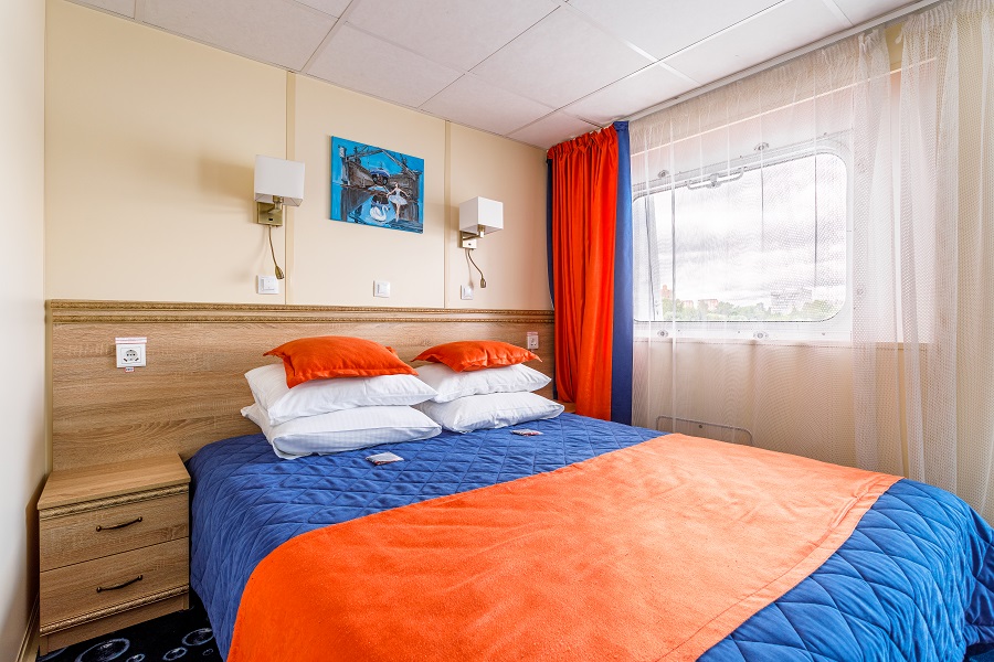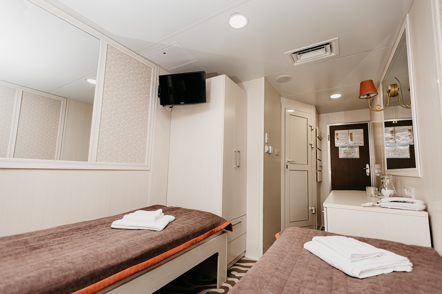 Средняя палуба | А2 комфорт К категории А2 комфорт относятся каюты: 313–354, 361, 362. Двухместная каюта со всеми удобствами, расположенная на средней палубе. Площадь каюты от 9,2 до 9,6 м². В каюте: две односпальные кровати, ванная комната (раковина, душ, туалет), трюмо, шкаф для одежды, стол, мягкий пуф, вешалка для верхней одежды, зеркало, радио, телевизор с кабельным и спутниковым вещанием, телефон, холодильник, тапочки, фен, набор посуды, пледы, щетка для одежды, оптимальное кол-во электрических розеток на 220V, кондиционер, обзорное окно. | 2-местное размещение | ✔ |