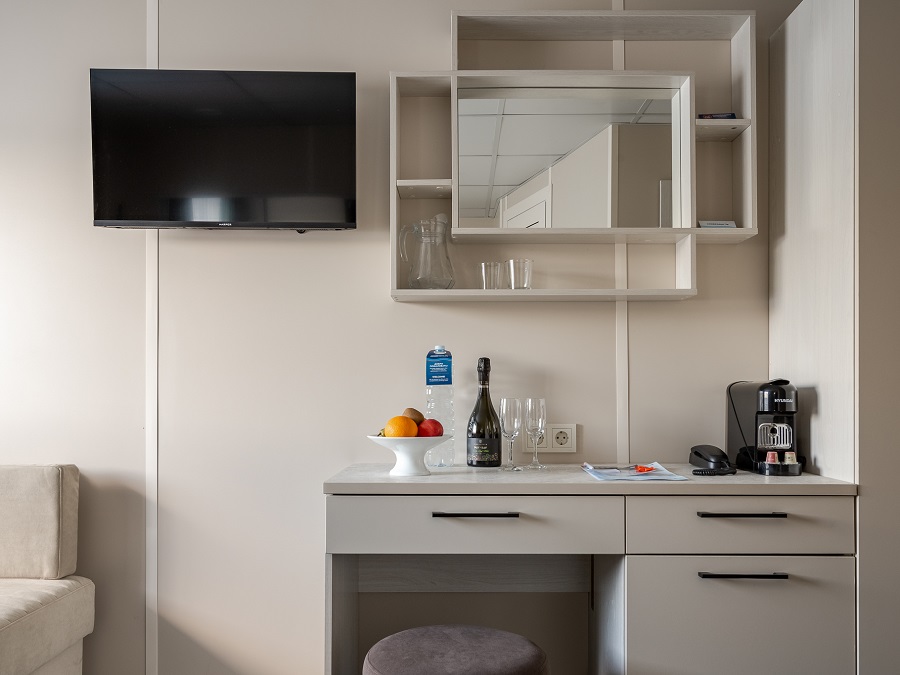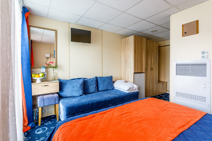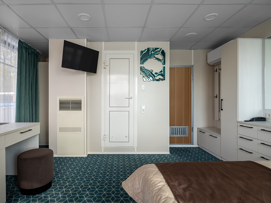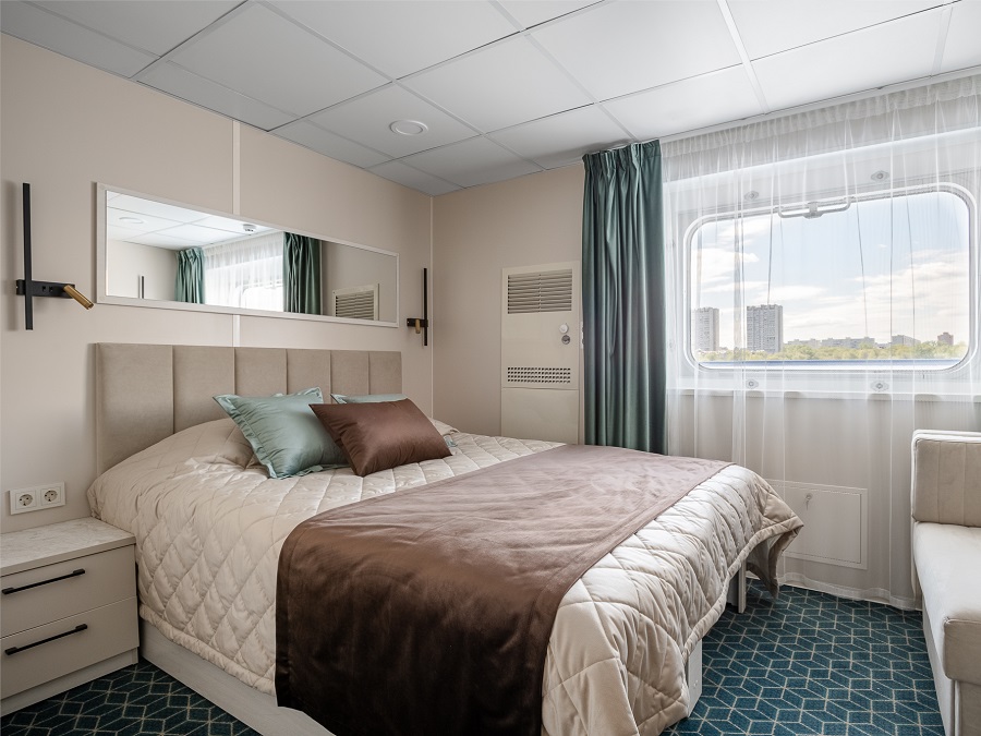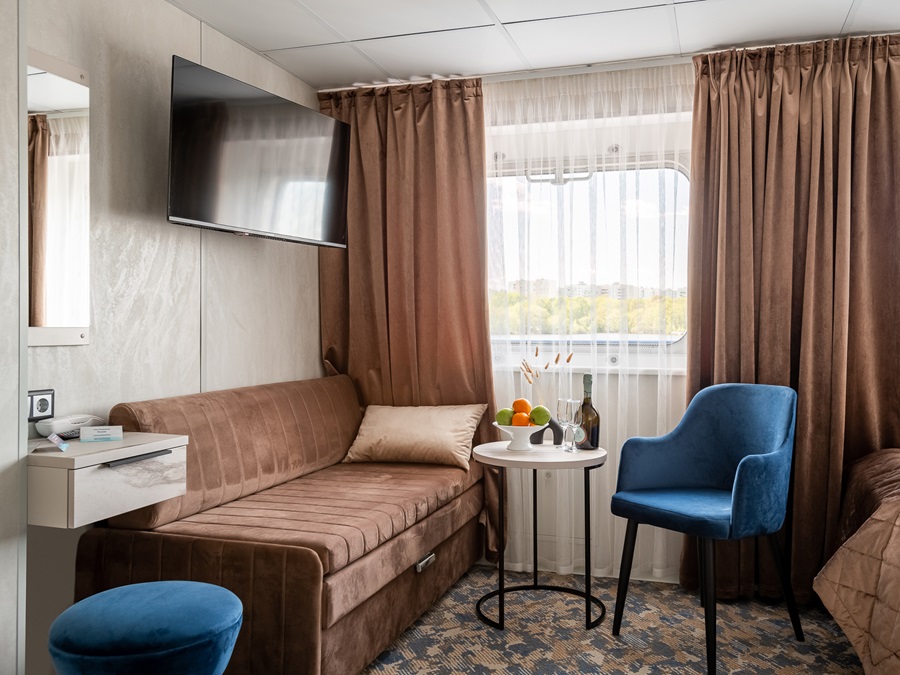 Средняя палуба | Полулюкс А К категории Полулюкс А относятся каюты: 309, 310.Двухместная каюта увеличенной площади со всеми удобствами, расположенная на средней палубе. Площадь каюты ≈ 16,4 м². Возможно размещение третьего и четвертого человека на дополнительных местах – двуспальный диван. Размещение ребенка до 5 лет без места и питания, при наличии свободного дополнительного места, производится только по согласованию с судоходной компанией. В каюте: одна двуспальная кровать (при необходимости трансформируется в две односпальные кровати), двуспальный диван, ванная комната (раковина, душевая кабина, туалет), шкаф, прикроватные тумбы, туалетный стол, зеркало, пуф, кресло, журнальный стол, вешалка для верхней одежды, холодильник, кондиционер, радио, плед для каждого туриста, сейф, фен, телевизор с кабельным и спутниковым вещанием, розетки 220V, обзорное окно.Также к услугам туристов в каюте: косметика для душа, туалетные принадлежности, щетка для одежды, банные халаты, маски для сна, тапочки, набор посуды и столовых приборов, питьевая вода и «приветственный набор» (игристый напиток, фрукты), мини-бар (за дополнительную плату), капсульная кофемашина (одна чашка кофе на человека – в подарок). | 2-местное размещение | ✔ |
