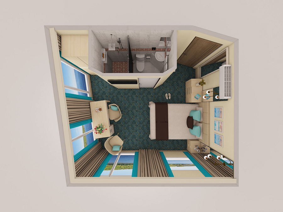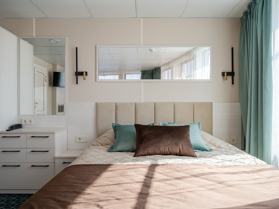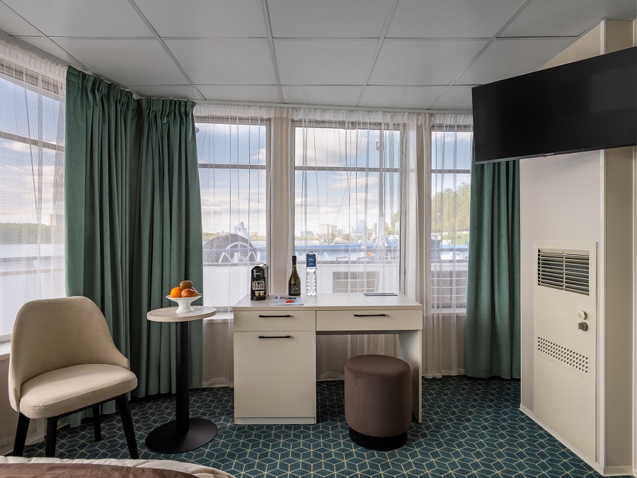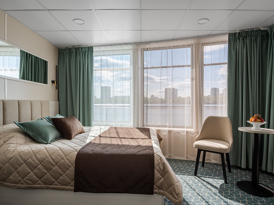 Средняя палуба | Панорамный полулюкс НОВИНКА 2025К категории Панорамный полулюкс относятся каюты: 363, 364.Двухместная каюта с панорамными окнами увеличенной площади со всеми удобствами, расположенная на средней палубе.Площадь каюты ≈ 17 м².В каюте: одна двуспальная кровать (при необходимости трансформируется в две односпальные кровати), ванная комната (раковина, душевая кабина, туалет), прикроватная тумба и комод, стол, два кресла, шкаф, зеркало, вешалка для верхней одежды, холодильник, кондиционер, сейф, телевизор с кабельным и спутниковым вещанием, радио, фен, розетки 220 V, плед для каждого туриста, панорамные окна. Также к услугам гостей: косметика для душа, туалетные принадлежности, щетка для одежды, банные халаты, маски для сна, тапочки, набор посуды и столовых приборов, чайная пара, питьевая вода, приветственный набор (игристый напиток, фрукты), капсульная кофемашина (одна чашка кофе на человека – в подарок), мини-бар (за дополнительную плату). | 2-местное размещение | ✔ |