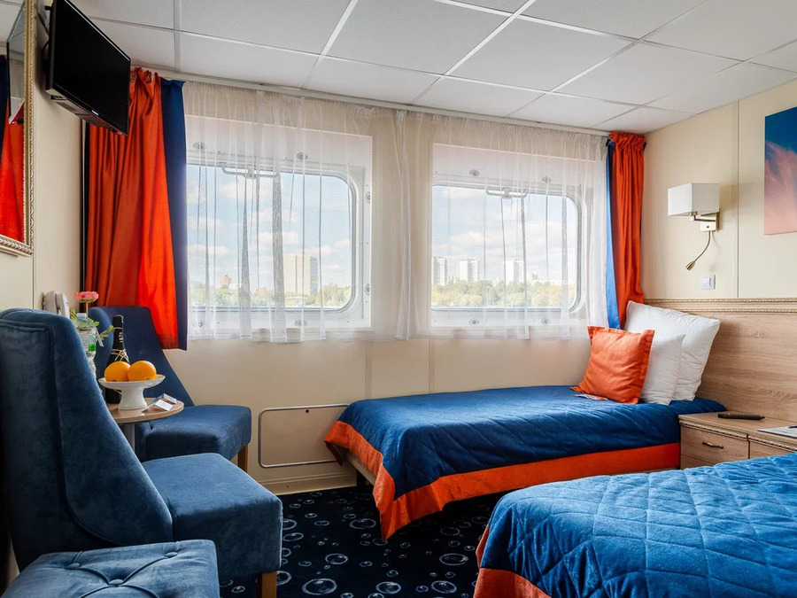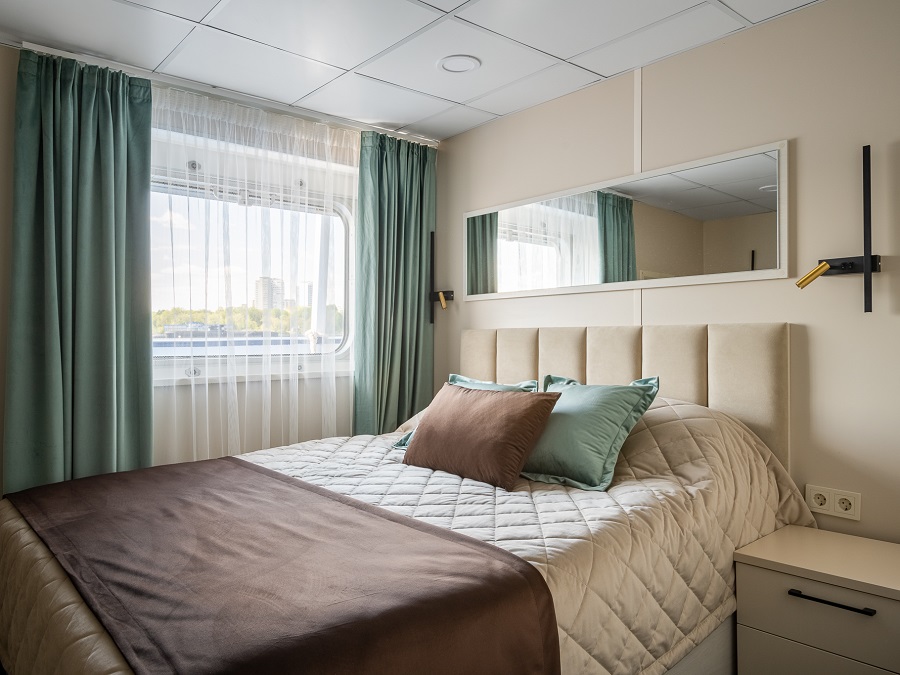 Средняя палуба | Полулюкс Б К категории Полулюкс Б относятся каюты: 305–308.Двухместная каюта увеличенной площади со всеми удобствами, расположенная на средней палубе. Площадь каюты ≈ 13 м².В каюте: одна двуспальная кровать (при необходимости трансформируется в две односпальные кровати), ванная комната (раковина, душевая кабина, туалет), прикроватные тумбы, туалетный стол, пуф, стол журнальный, два кресла, вешалка для верхней одежды, шкаф, холодильник, кондиционер, радио, фен, плед для каждого туриста, сейф, телевизор с кабельным и спутниковым вещанием, телефон, розетки 220V, обзорное панорамное окно.Также к услугам туристов в каюте: косметика для душа, туалетные принадлежности, щетка для одежды, банные халаты, маски для сна, тапочки, набор посуды и столовых приборов, питьевая вода и «приветственный набор» (игристый напиток, фрукты), мини-бар (за дополнительную плату), капсульная кофемашина (одна чашка кофе на человека – в подарок). | 2-местное размещение | ✔ |