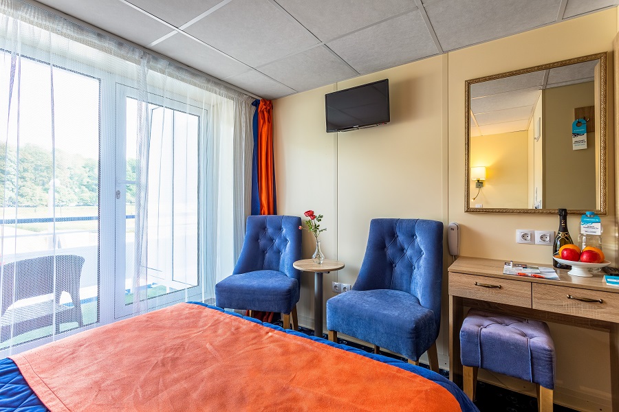 Шлюпочная палуба | Полулюкс К категории Полулюкс относятся каюты: 425–428. Двухместная каюта увеличенной площади со всеми удобствами, расположенная на шлюпочной палубе. Площадь каюты ≈ 12,3 м².В каюте: одна двуспальная кровать (при необходимости трансформируется в две односпальные кровати), ванная комната (раковина, душевая кабина, туалет), прикроватные тумбы, вешалка для верхней одежды, кофейный стол, два кресла, шкаф, пуф, зеркало, холодильник, кондиционер, сейф, радио, фен, плед для каждого туриста, телевизор с кабельным и спутниковым вещанием, розетки 220 V, два обзорных окна.Также к услугам туристов в каюте: косметика для душа, туалетные принадлежности, щетка для одежды, банные халаты, маски для сна, тапочки, набор посуды и столовых приборов, чайная пара, питьевая вода и «приветственный набор» (игристый напиток, фрукты), мини-бар (за дополнительную плату), капсульная кофемашина (одна чашка кофе на человека – в подарок). | 2-местное размещение | ✔ |