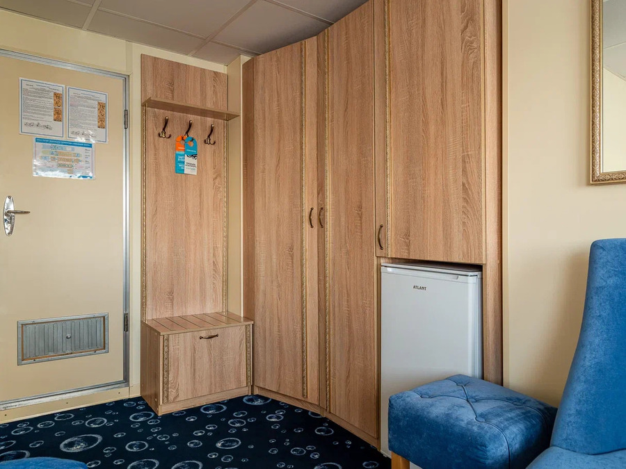 Главная палуба | Полулюкс Б-С НОВИНКА 2025К категории Полулюкс Б-С относятся каюты: 203–205, 210, 211, 213, 214, 216, 219, 222, 223. Двухместная каюта увеличенной площади со всеми удобствами, расположенная на главной палубе. Площадь каюты ≈ 13,8 м². Возможно размещение третьего человека на дополнительном месте – кресло-кровать. Размер дополнительного места: 190 см длина и 75 см ширина. Размещение ребенка до 5 лет без места и питания, при наличии свободного дополнительного места, производится только по согласованию с судоходной компанией. В каюте 216 кровать не раздвигается. В каюте: одна двуспальная кровать (при необходимости трансформируется в две односпальные кровати), кресло-кровать, ванная комната (раковина, душевая кабина, туалет), прикроватные тумбы, туалетный стол, настенная полка, пуф, вешалка для верхней одежды, шкаф, холодильник, кондиционер, радио, фен, плед для каждого туриста, сейф, телевизор с кабельным и спутниковым вещанием, телефон, розетки 220V, одно панорамное окно. Также к услугам гостей: косметика для душа, туалетные принадлежности, щетка для одежды, банные халаты, маски для сна, тапочки, набор посуды и столовых приборов, питьевая вода и «приветственный набор» (игристый напиток, фрукты), мини-бар (за дополнительную плату), капсульная кофемашина (одна чашка кофе на человека – в подарок). | 2-местное размещение | ✔ |