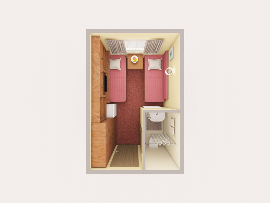 Средняя палуба | А2(III) К категории А2(III) относятся каюты: 207–236, 307–312. Двухместная каюта со всеми удобствами, расположенная на главной и в корме средней палубах.Площадь каюты от 8,5 до 10 м².В каюте: две односпальные кровати, ванная комната (раковина, душ, туалет), шкаф, стол, настенная полка, холодильник, радио, кондиционер, телевизор с кабельным и спутниковым вещанием, фен, плед для каждого туриста, щетка для одежды, розетки 220 V, обзорное окно. | 2-местное размещение | ✔ |