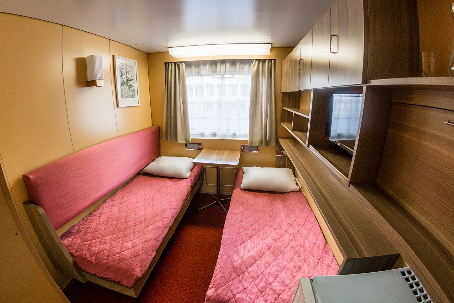 Нижняя палуба | А2н К категории А2н относятся каюты: 103, 104, 107, 108, 111, 112.Двухместная каюта со всеми удобствами, расположенная на нижней палубе. Площадь каюты от 11,7 до 12,7 м². Возможно размещение третьего и четвертого человека на дополнительном спальном месте верхнего расположения. Размещение ребенка до 5 лет без места и питания, при наличии свободного дополнительного места, производится только по согласованию с судоходной компанией. В каюте: две односпальные кровати и два спальных места верхнего расположения, ванная комната (раковина, душ, туалет), шкаф, настенная полка, стол, два стула, кондиционер, холодильник, радио, телевизор с кабельным и спутниковым вещанием, фен, плед для каждого туриста, щетка для одежды, розетки 220 V, иллюминаторы. | 2-местное размещение | ✔ |