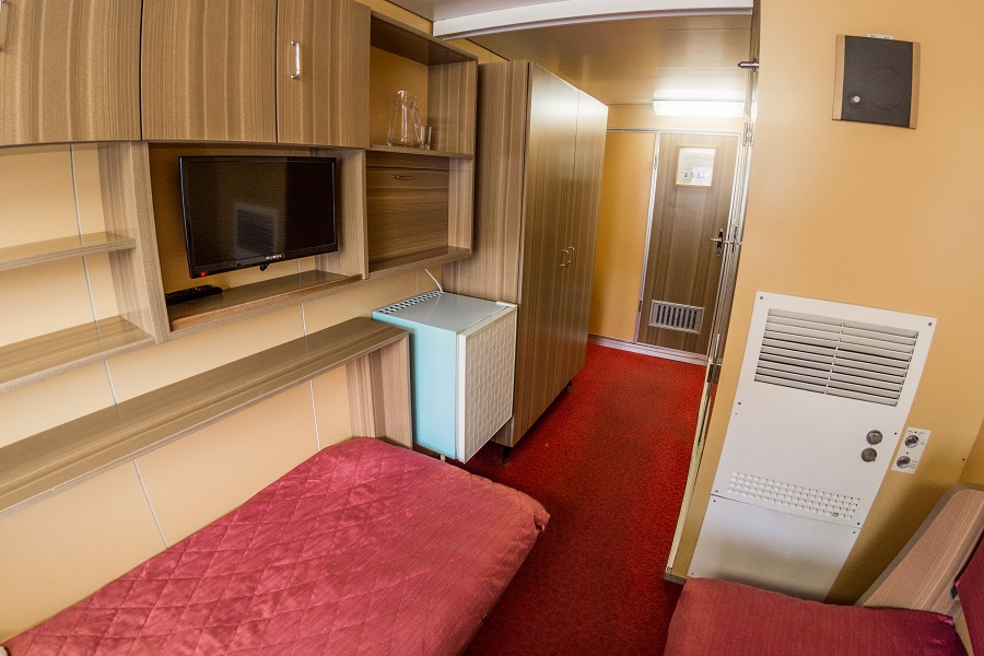 Шлюпочная палуба | А1 К категории А1 относятся каюты: 437–446. Одноместная каюта со всеми удобствами, расположенная на шлюпочной палубе. Площадь каюты от 6,2 до 7,4 м².В каюте: односпальная кровать, ванная комната (раковина, душ, туалет), шкаф, стол, настенная полка, холодильник, радио, кондиционер, телевизор с кабельным и спутниковым вещанием, фен, плед, щетка для одежды, розетки 220 V, обзорное окно. | 1-местное размещение | ✔ |