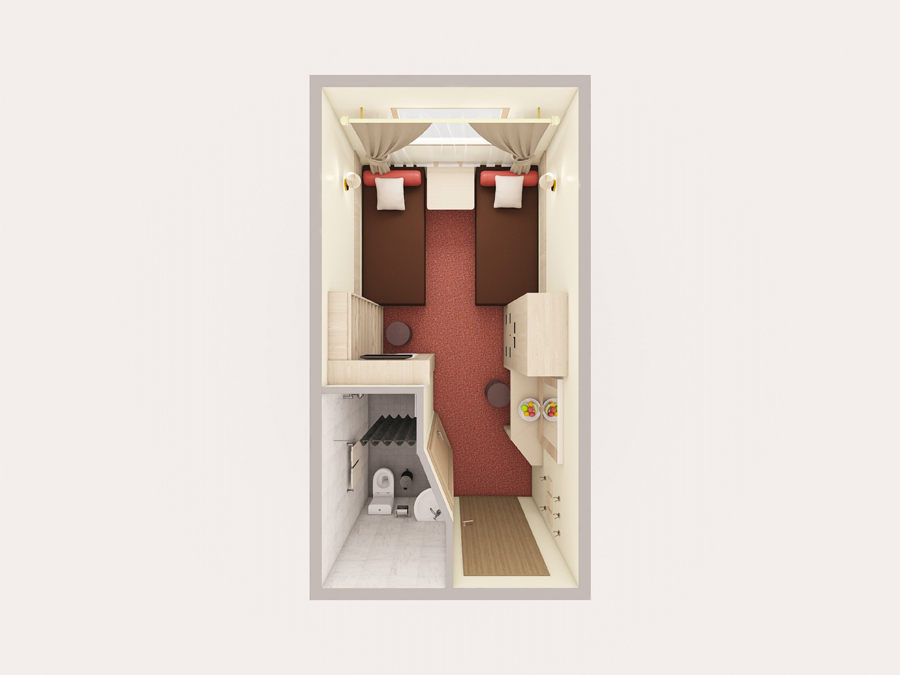 Средняя палуба | А2(II) К категории А2(II) относятся каюты: 313–336. Двухместная каюта со всеми удобствами, расположенная на средней палубе.Площадь каюты ≈ 10 м². В каютах 313–324 возможно размещение третьего человека на дополнительном спальном месте – верхняя полка с мягким ограждением. В каютах 313, 314 частично ограниченный обзор из-за находящегося рядом трапа. Размещение ребенка до 5 лет без места и питания, при наличии свободного дополнительного места, производится только по согласованию с судоходной компанией. В навигации 2026 каюты 325–336 переходят в категорию А2 комфорт. Изображение кают является рендером и носит ознакомительный характер. В каюте: две односпальные кровати, ванная комната (раковина, душ, туалет), шкаф, стол, настенная полка, холодильник, радио, кондиционер, телевизор с кабельным и спутниковым вещанием, фен, плед для каждого туриста, щетка для одежды, розетки 220 V, обзорное окно. | 2-местное размещение | ✔ |
