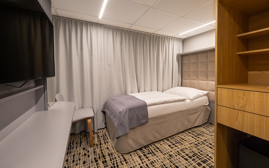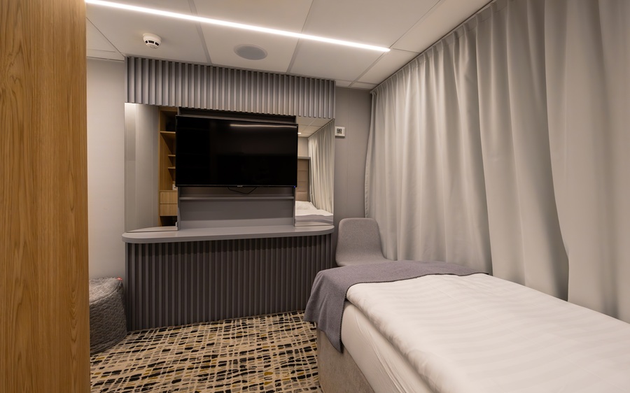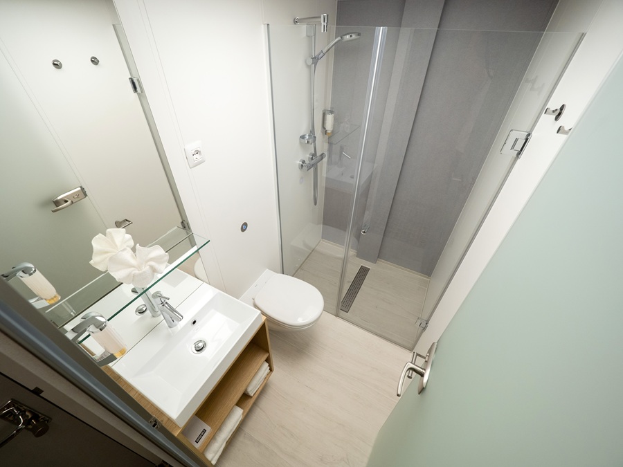 | Upper deck (верхняя палуба) | SINGLE A К категории SINGLE A относятся каюты: 322, 324.Одноместная каюта, расположенная на верхней палубе.Площадь каюты ≈ 9 м². Размер кровати – 80х200 см. В каюте: односпальная кровать, ванная комната (раковина, душ, туалет), шкаф для одежды, фен, сейф, спутниковое телевидение, телефон внутренней связи, радио, автоматическая система кондиционирования, мини-бар (оплачивается дополнительно), стеклянная балконная дверь, французский балкон. | 1-местное размещение | нет |