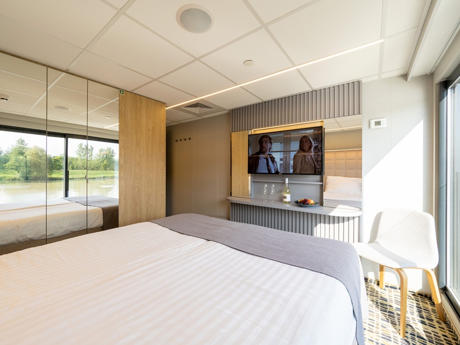 | Upper deck (верхняя палуба) | DOUBLE A К категории DOUBLE A относятся каюты: 303, 305-321, 323, 325-331.Двухместная каюта, расположенная на верхней палубе.Площадь каюты ≈ 14 м². Размер кровати – 160х200 см. В каюте: двуспальная кровать (при необходимости трансформируется в две односпальные кровати), ванная комната (раковина, душ, туалет), шкаф для одежды, фен, сейф, спутниковое телевидение, телефон внутренней связи, радио, автоматическая система кондиционирования, мини-бар (оплачивается дополнительно), стеклянная балконная дверь, французский балкон. | 2-местное размещение | ✔ |