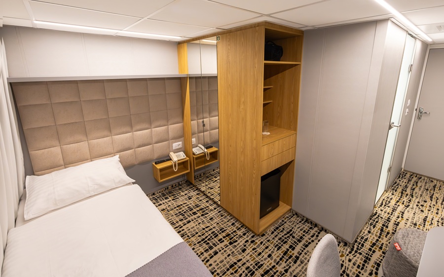 | Middle deck (средняя палуба) | SINGLE B К категории SINGLE B относятся каюты: 203, 205, 240, 242.Одноместная каюта, расположенная на средней палубе.Площадь каюты ≈ 9 м². Размер кровати – 80х200 см. В каюте: односпальная кровать, ванная комната (раковина, душ, туалет), шкаф для одежды, фен, сейф, спутниковое телевидение, телефон внутренней связи, радио, автоматическая система кондиционирования, мини-бар (оплачивается дополнительно), стеклянная балконная дверь, французский балкон. | 1-местное размещение | нет |