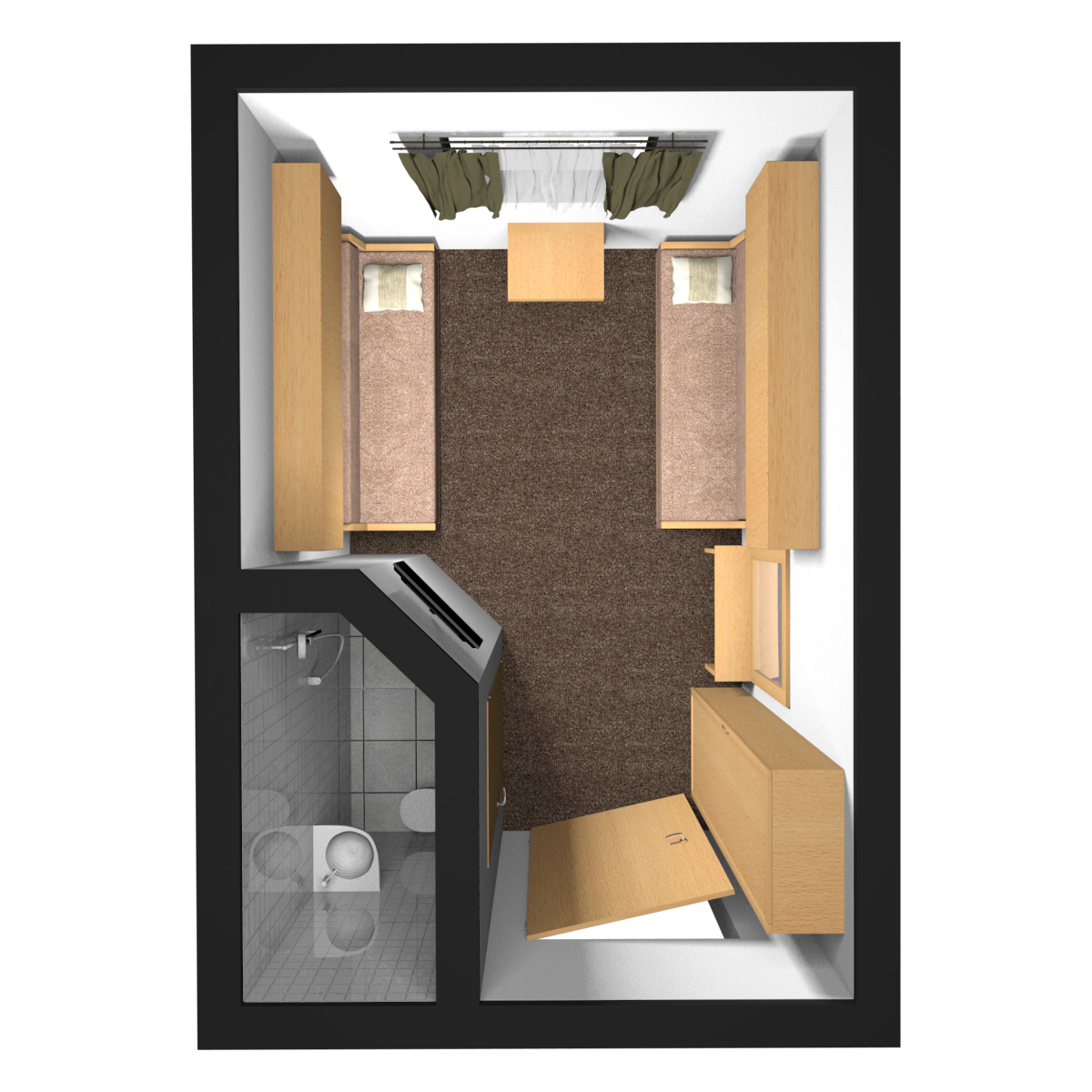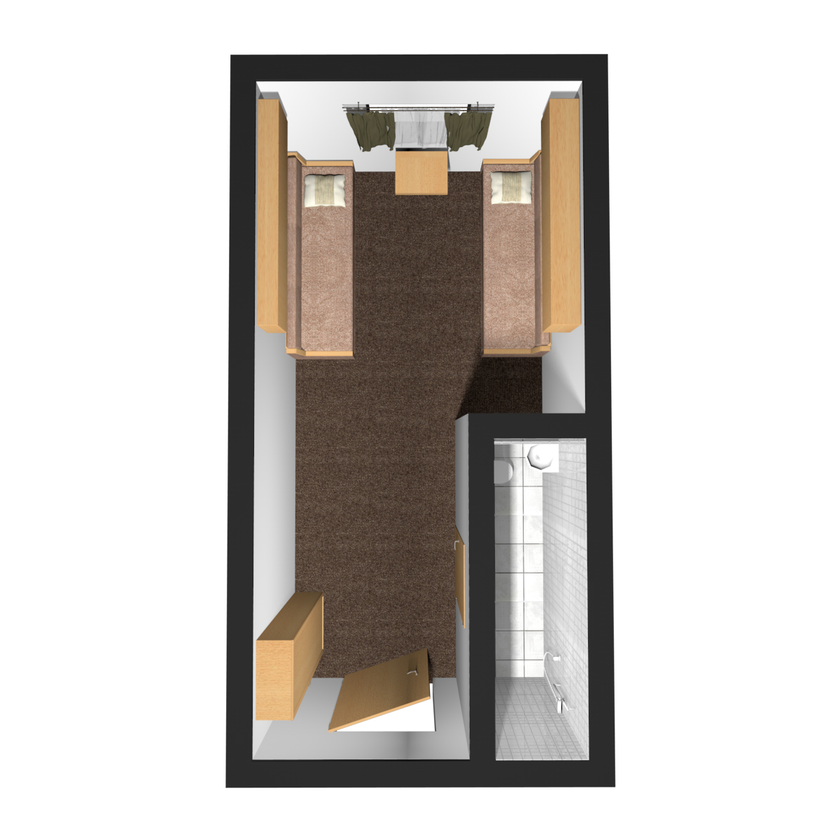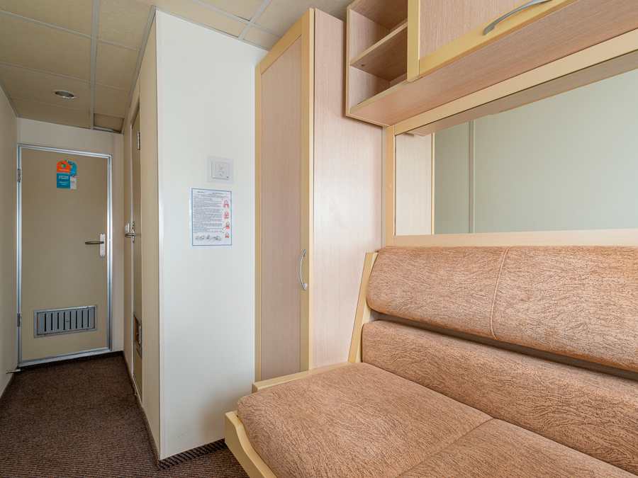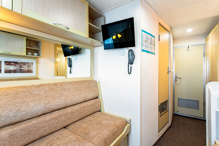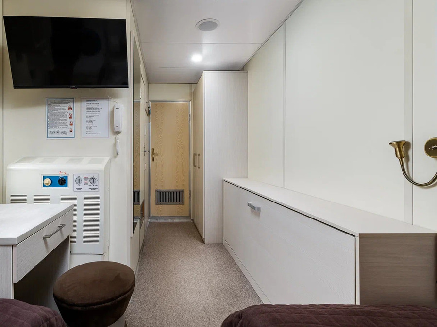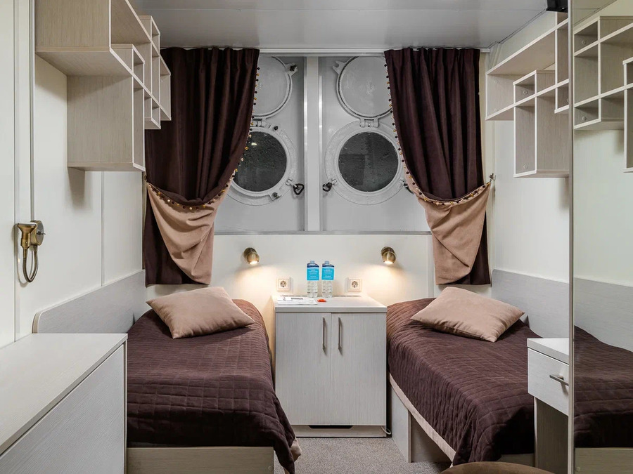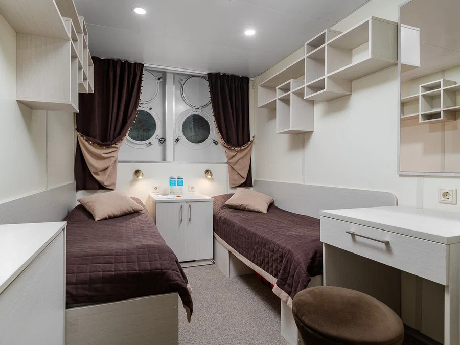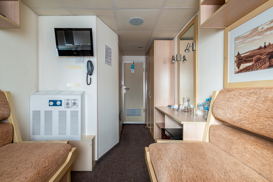 Нижняя палуба | А2н К категории А2н относятся каюты: 112, 114, 116, 118, 120. Двухместная каюта увеличенной площади со всеми удобствами, расположенная на нижней палубе. Площадь каюты ≈ 10 м². В каютах 112, 114, 116 возможно размещение третьего человека на дополнительном месте. Размещение ребенка до 5 лет без места и питания, при наличии свободного дополнительного места, производится только по согласованию с судоходной компанией. В каюте: две односпальные кровати, ванная комната (душ, раковина, туалет), шкаф, вешалка для верхней одежды, стол, два пуфа, зеркало, кондиционер, холодильник, радио, телевизор с кабельным и спутниковым вещанием, телефон, фен, розетки 220V, щетка для одежды, индивидуальный плед, питьевая вода, иллюминаторы. | 2-местное размещение | нет |