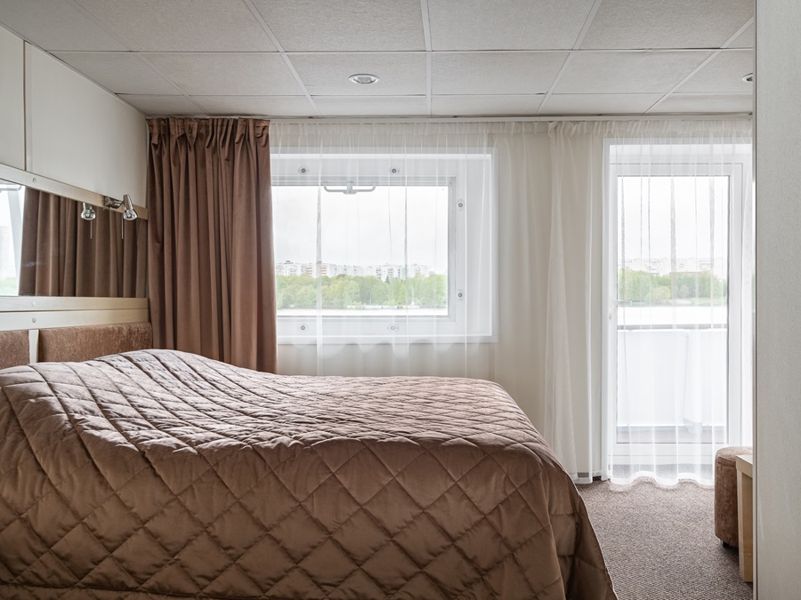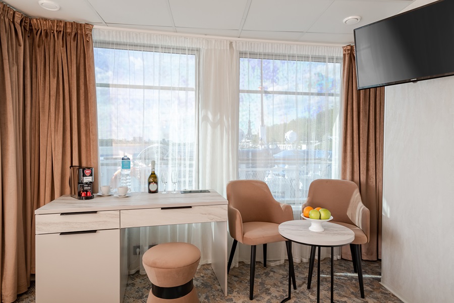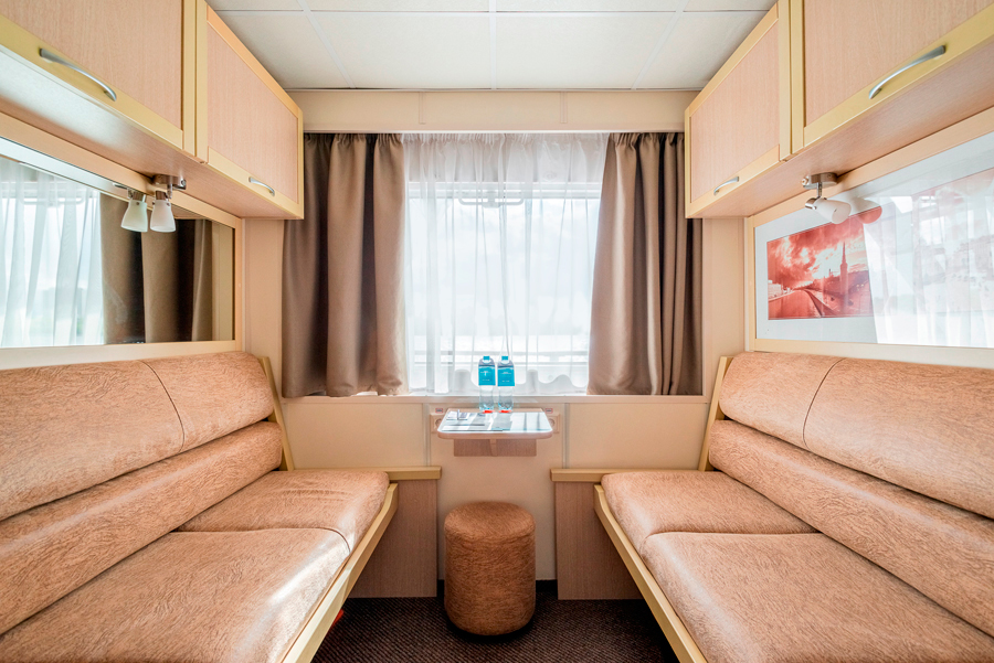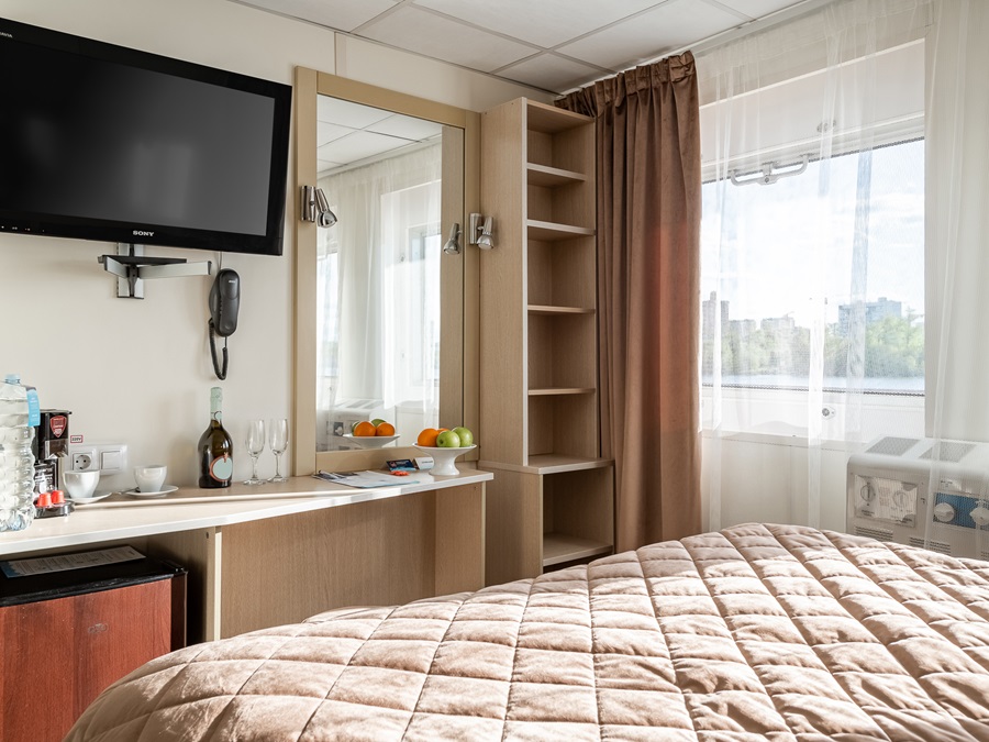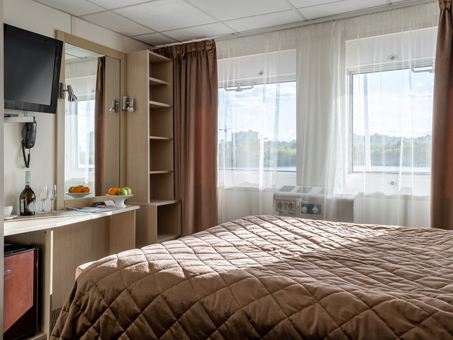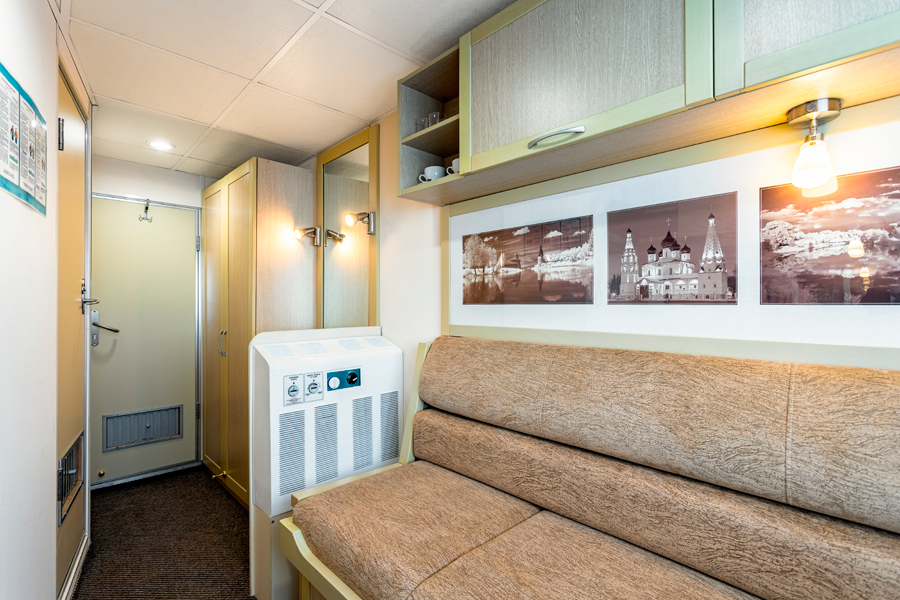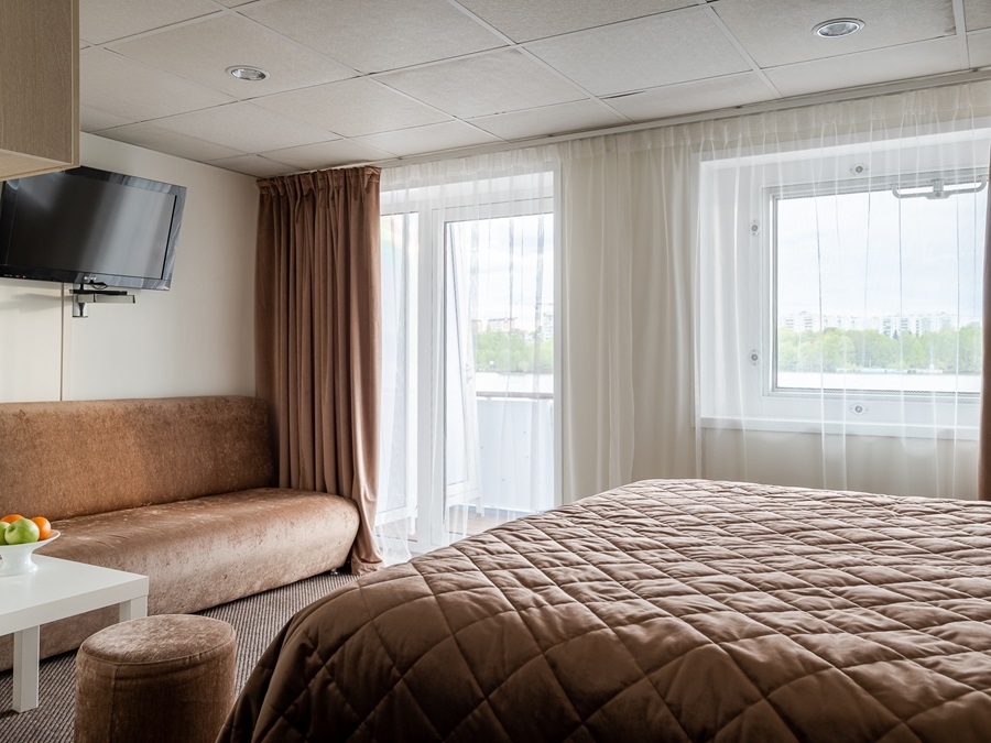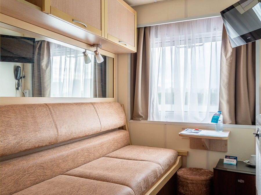 Средняя палуба | Полулюкс А К категории Полулюкс А относятся каюты: 339–342. Двухместная каюта увеличенной площади со всеми удобствами, расположенная на средней палубе. Площадь каюты ≈ 19,8 м². Возможно размещение третьего и четвертого человека на дополнительных местах – двуспальный диван. Размещение ребенка до 5 лет без места и питания, при наличии свободного дополнительного места, производится только по согласованию с судоходной компанией. В каюте: одна двуспальная кровать (при необходимости трансформируется в две односпальные кровати), двуспальный диван, ванная комната (раковина, душ, туалет), прикроватные тумбы, пуф, стол, зеркало, сейф, холодильник, кондиционер, радио, шкаф, вешалка для верхней одежды, фен, индивидуальный плед, телевизор с кабельным и спутниковым вещанием, розетки 220V, обзорное окно. Также к услугам гостей: косметика для душа, туалетные принадлежности, щетка для одежды, банные халаты, маски для сна, тапочки, набор посуды и столовых приборов, чайная пара, питьевая вода и «приветственный набор» (игристый напиток, фрукты), мини-бар (за дополнительную плату), капсульная кофемашина (одна чашка кофе на человека – в подарок). | 2-местное размещение | нет |