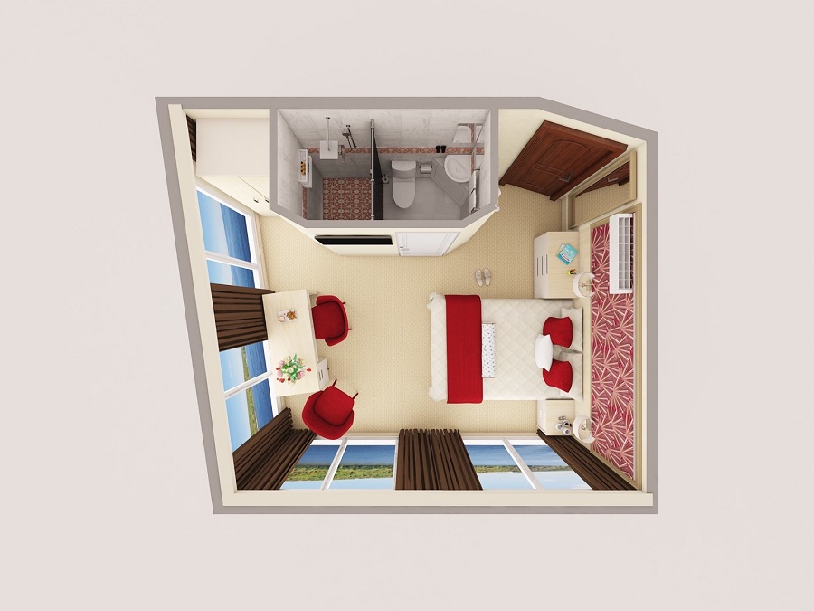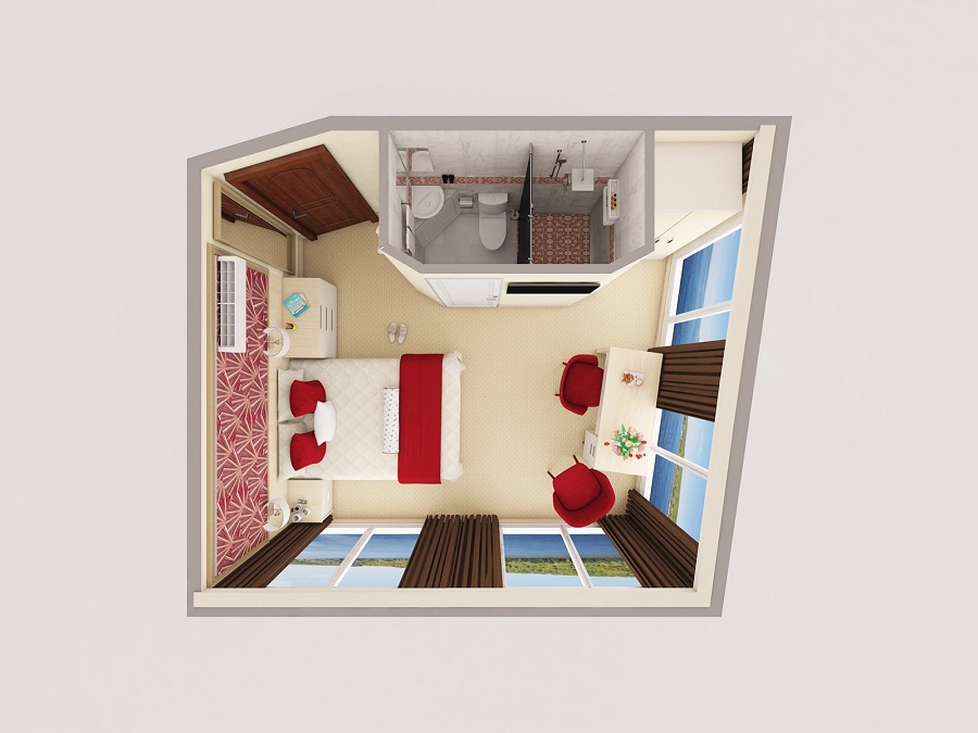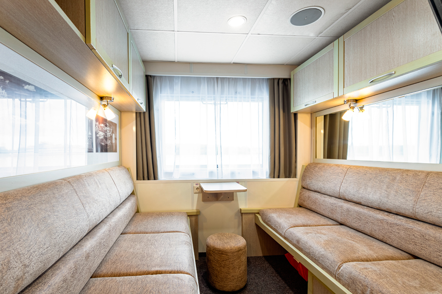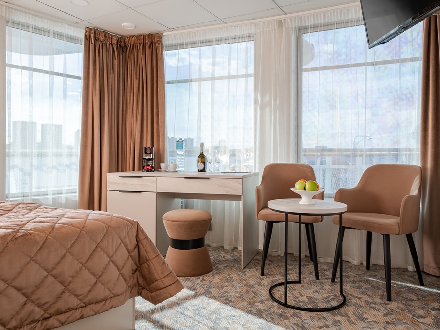 Средняя палуба | Панорамный полулюкс К категории Панорамный полулюкс относятся каюты: 353, 354.Двухместная каюта с панорамными окнами увеличенной площади со всеми удобствами, расположенная на средней палубе.Площадь каюты ≈ 16,4 м².В каюте: одна двуспальная кровать (при необходимости трансформируется в две односпальные кровати), ванная комната (раковина, душевая кабина, туалет), прикроватная тумба и комод, стол, два кресла, шкаф, зеркало, вешалка для верхней одежды, холодильник, кондиционер, сейф, телевизор с кабельным и спутниковым вещанием, радио, фен, розетки 220 V, плед для каждого туриста, панорамные окна. Также к услугам туристов в каюте: косметика для душа, туалетные принадлежности, щетка для одежды, банные халаты, маски для сна, тапочки, набор посуды и столовых приборов, чайная пара, питьевая вода, приветственный набор (игристый напиток, фрукты), капсульная кофемашина (одна чашка кофе на человека – в подарок), мини-бар (за дополнительную плату). | 2-местное размещение | нет |