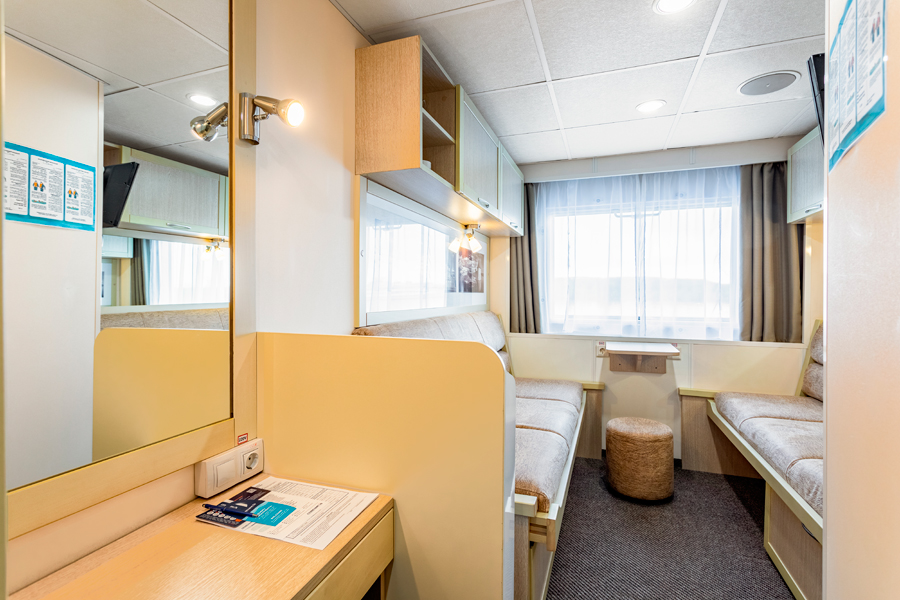 Шлюпочная палуба | А2 комфорт (шлюпочная палуба) К категории А2 комфорт (шлюпочная палуба) относятся каюты: 401, 403, 404. Двухместная каюта со всеми удобствами, расположенная на шлюпочной палубе. Каюта с эргономичным дизайном и современной отделкой.Площадь каюты от 9,5 до 9,8 м².В каюте: две односпальные кровати, ванная комната (раковина, душ, туалет), шкаф для одежды, стол, мягкий пуф, зеркало, вешалка для верхней одежды, настенная полка, радио, телевизор с кабельным и спутниковым вещанием, телефон, сейф, фен, холодильник, индивидуальный плед, тапочки, набор посуды, розетки 220V, щетка для одежды, кондиционер, обзорное окно. | 2-местное размещение | ✔ |