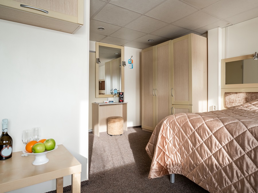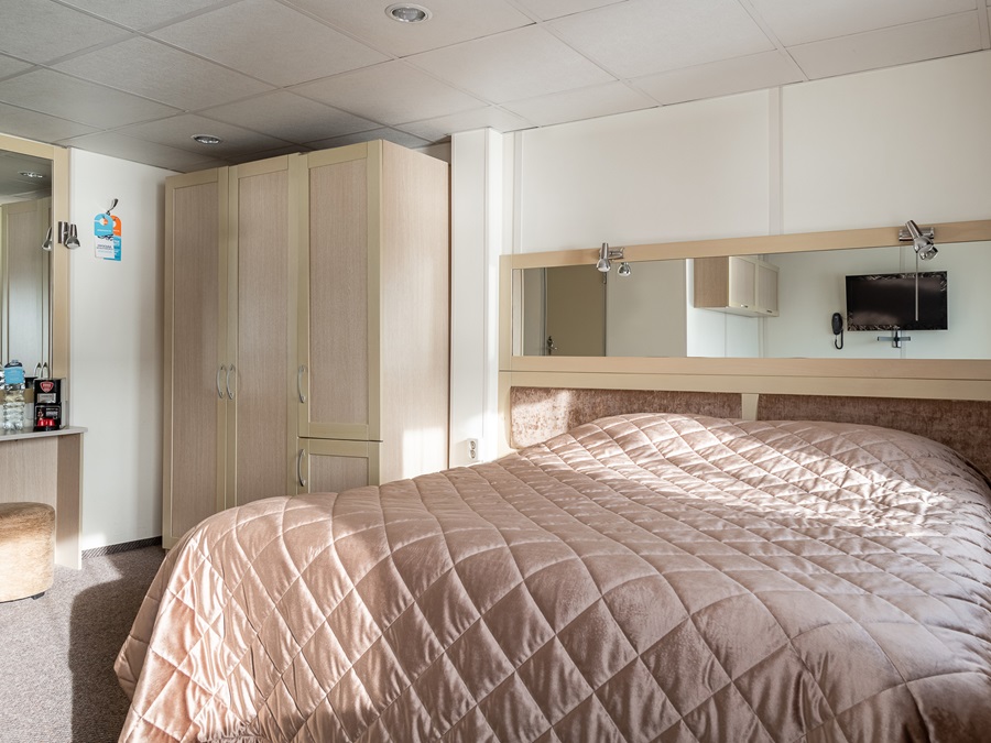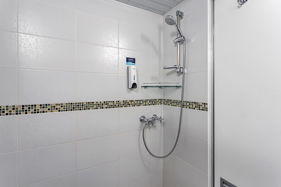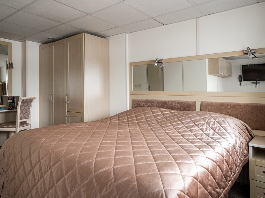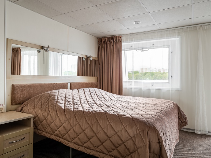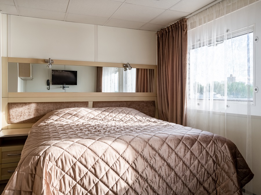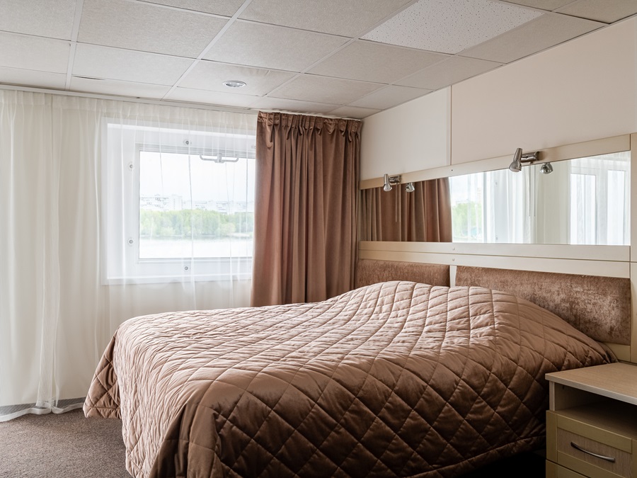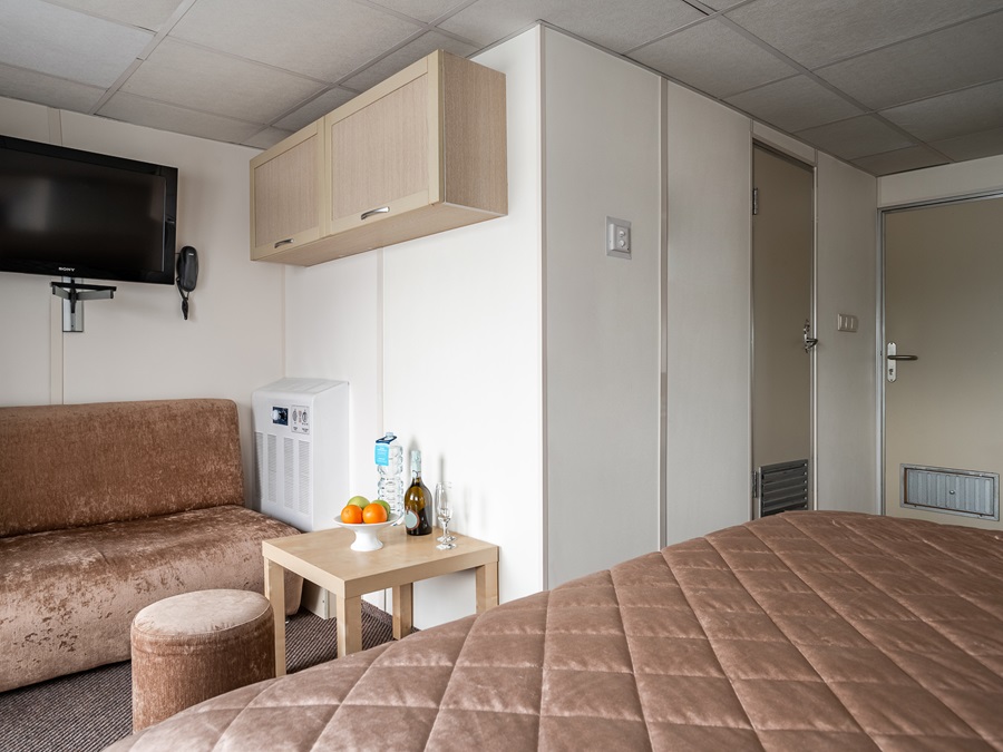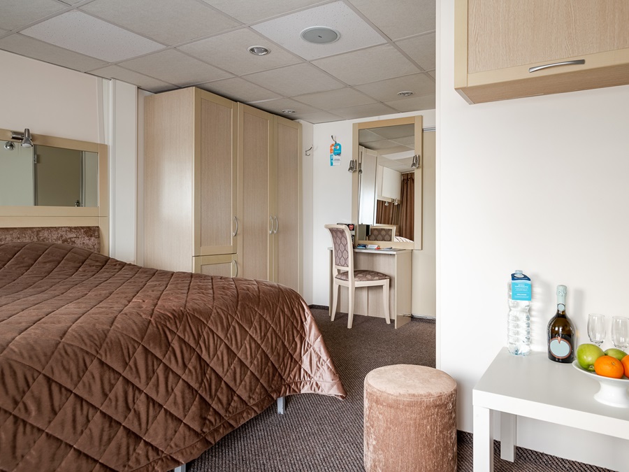 Средняя палуба | Полулюкс Б К категории Полулюкс Б относятся каюты: 301–308, 345–352.Двухместная каюта увеличенной площади со всеми удобствами, расположенная на средней палубе.Площадь каюты от 12,8 до 14,9 м².В каюте: одна двуспальная кровать (при необходимости трансформируется в две односпальные кровати), ванная комната (раковина, душ, туалет), прикроватные тумбы, пуф, стол, зеркало, холодильник, телефон, сейф, кондиционер, радио, шкаф, вешалка для верхней одежды, фен, плед для каждого туриста, телевизор с кабельным и спутниковым вещанием, розетки 220V, обзорное окно. Также к услугам гостей: косметика для душа, туалетные принадлежности, щетка для одежды, банные халаты, маски для сна, тапочки, набор посуды и столовых приборов, чайная пара, питьевая вода и «приветственный набор» (игристый напиток, фрукты), мини-бар (за дополнительную плату), капсульная кофемашина (одна чашка кофе на человека – в подарок). | 2-местное размещение | ✔ |