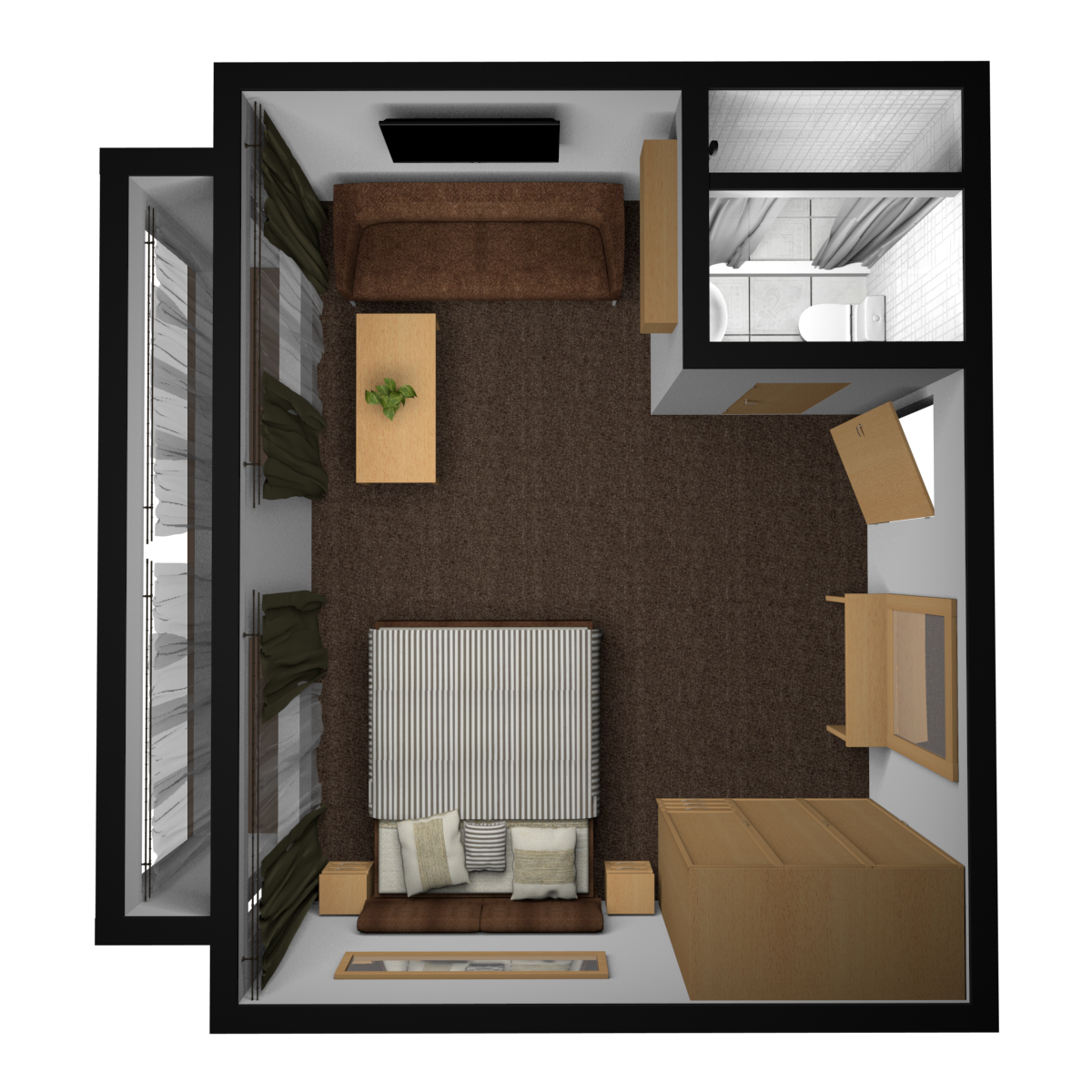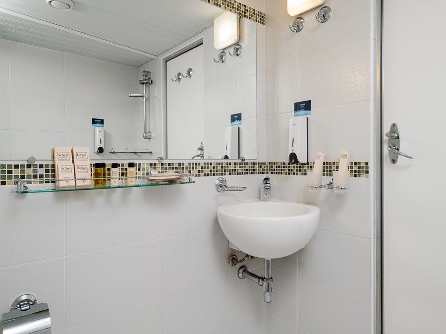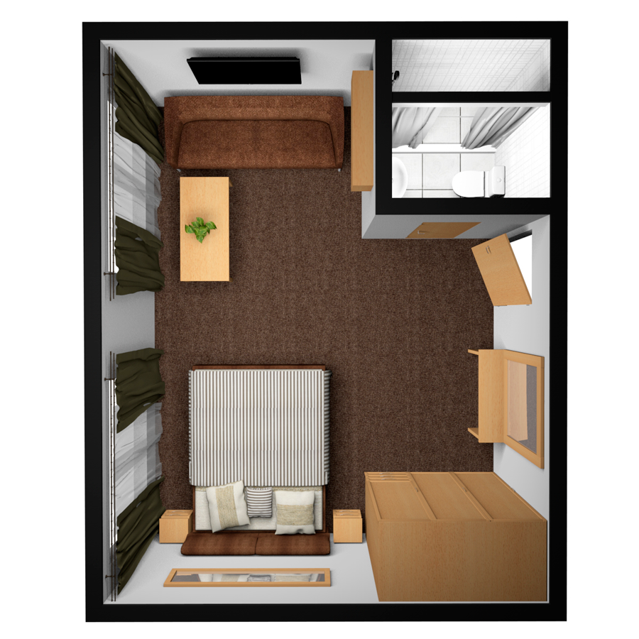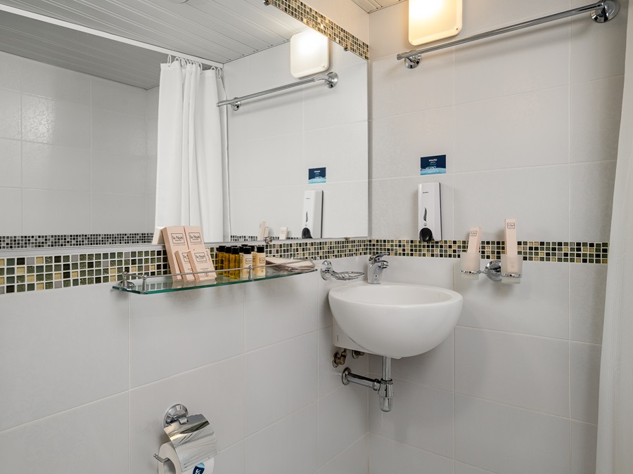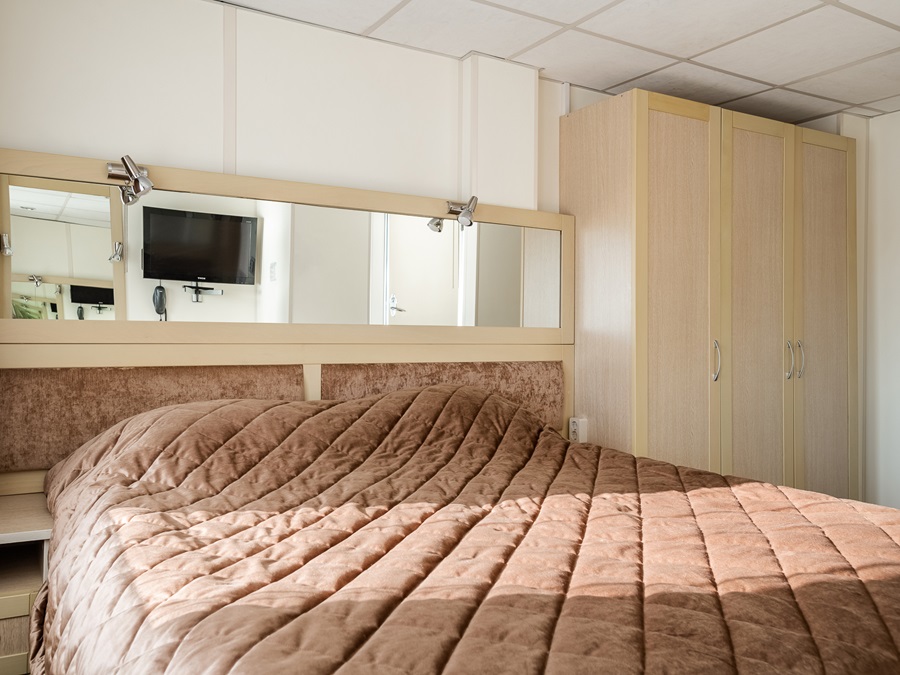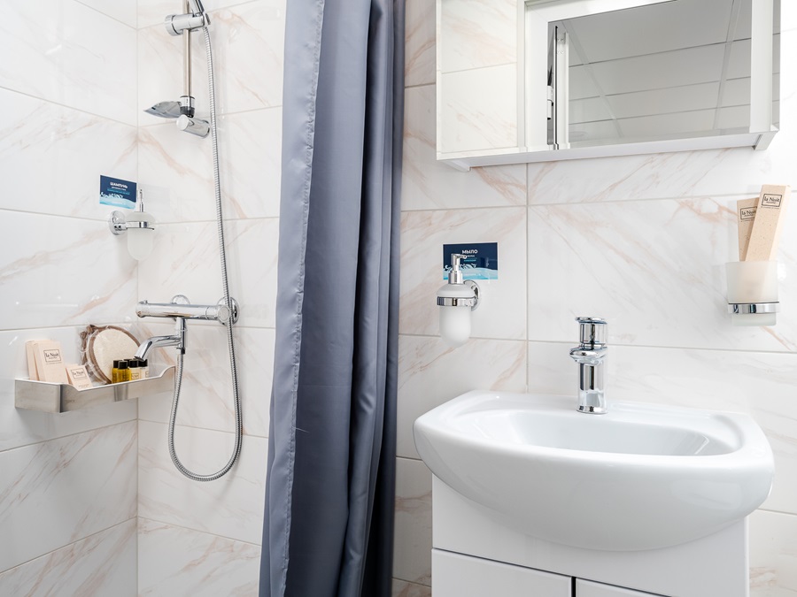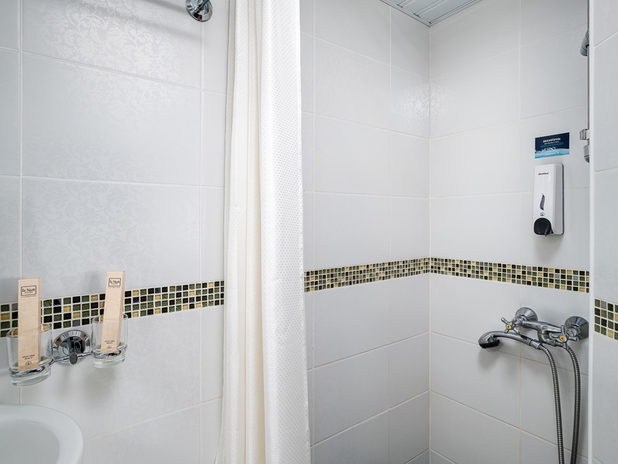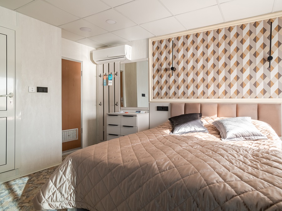 Средняя палуба | Полулюкс Б К категории Полулюкс Б относятся каюты: 301–308, 345–352.Двухместная каюта увеличенной площади со всеми удобствами, расположенная на средней палубе.Площадь каюты от 12,8 до 14,9 м².В каюте: одна двуспальная кровать (при необходимости трансформируется в две односпальные кровати), ванная комната (раковина, душ, туалет), прикроватные тумбы, пуф, стол, зеркало, холодильник, телефон, сейф, кондиционер, радио, шкаф, вешалка для верхней одежды, фен, плед для каждого туриста, телевизор с кабельным и спутниковым вещанием, розетки 220V, обзорное окно. Также к услугам гостей: косметика для душа, туалетные принадлежности, щетка для одежды, банные халаты, маски для сна, тапочки, набор посуды и столовых приборов, чайная пара, питьевая вода и «приветственный набор» (игристый напиток, фрукты), мини-бар (за дополнительную плату), капсульная кофемашина (одна чашка кофе на человека – в подарок). | 2-местное размещение | ✔ |
