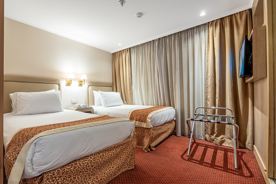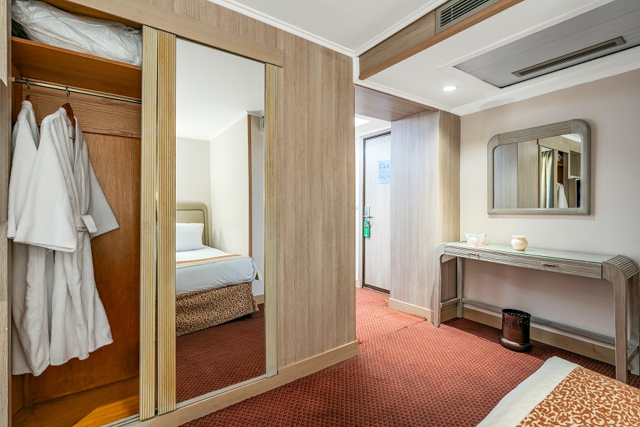 | 1 палуба | Twin (type III) К категории Twin (type III) относятся каюты: 101–112, 114, 116, 118.Двухместная каюта со всеми удобствами, расположенная на первой палубе.Площадь каюты ≈ 18 м². Бутилированная вода – ежедневное пополнение (0,5 л/чел). В каюте: одна двуспальная кровать (при необходимости трансформируется в две односпальные кровати), ванная комната (раковина, душевая кабина, туалет), кондиционер с отдельным блоком управления, спутниковое телевидение, сейф, фен, туалетные принадлежности, мини-бар, питьевая вода, телефон, обзорное окно. | 2-местное размещение | ✔ |