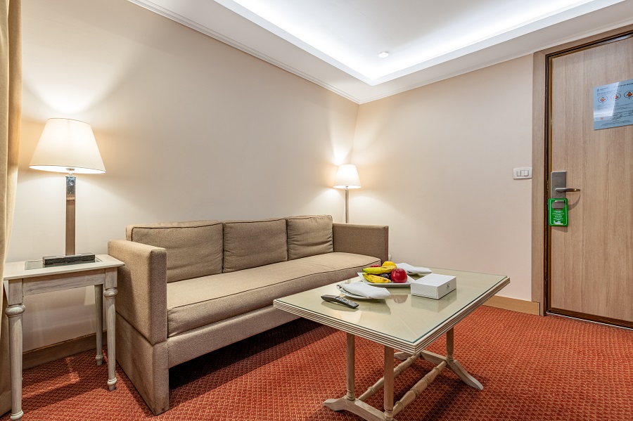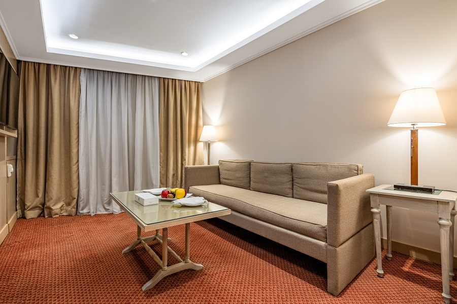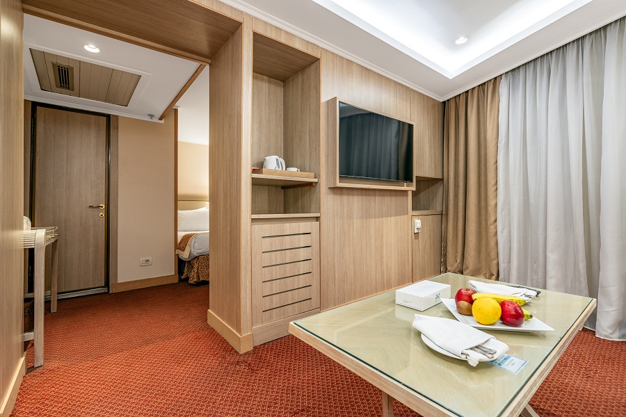 | 2 палуба | Suite К категории Suite относятся каюты: 201, 202.Двухкомнатная двухместная каюта со всеми удобствами, расположенная на второй палубе.Площадь каюты ≈ 28 м². Бутилированная вода – ежедневное пополнение (0,5 л/чел). Возможно размещение третьего человека на дополнительном спальном месте – диван. В каюте: одна двуспальная кровать (при необходимости трансформируется в две односпальные кровати), диван, ванная комната (раковина, душевая кабина, туалет), кондиционер с отдельным блоком управления, спутниковое телевидение, сейф, фен, туалетные принадлежности, мини-бар, питьевая вода, телефон, обзорное окно. | 2-местное размещение | ✔ |