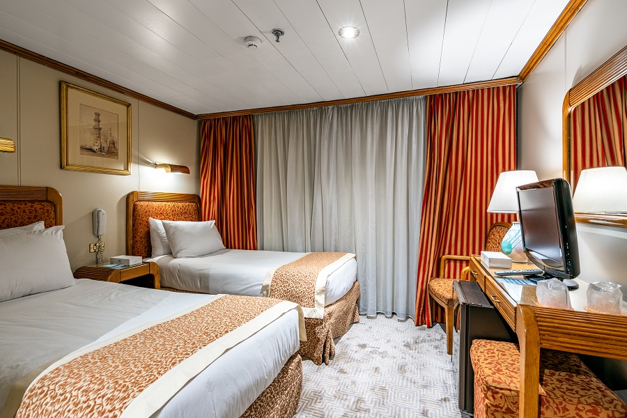 | 2 палуба | Twin (type II) К категории Twin (type II) относятся каюты: 203–209.Двухместная каюта со всеми удобствами, расположенная на второй палубе.Площадь каюты ≈ 18 м². Бутилированная вода – ежедневное пополнение (0,5 л/чел). В каюте: одна двуспальная кровать (при необходимости трансформируется в две односпальные кровати), ванная комната (раковина, душевая кабина, туалет), кондиционер с отдельным блоком управления, спутниковое телевидение, сейф, фен, туалетные принадлежности, мини-бар, питьевая вода, телефон, обзорное окно. | 2-местное размещение | ✔ |