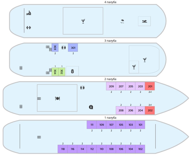 | Палуба | Тип каюты | Размещение | Наличие мест | Тариф Взрослый | Тариф Детский | |