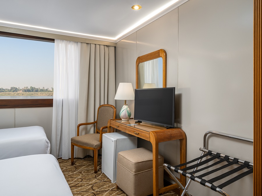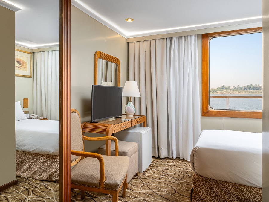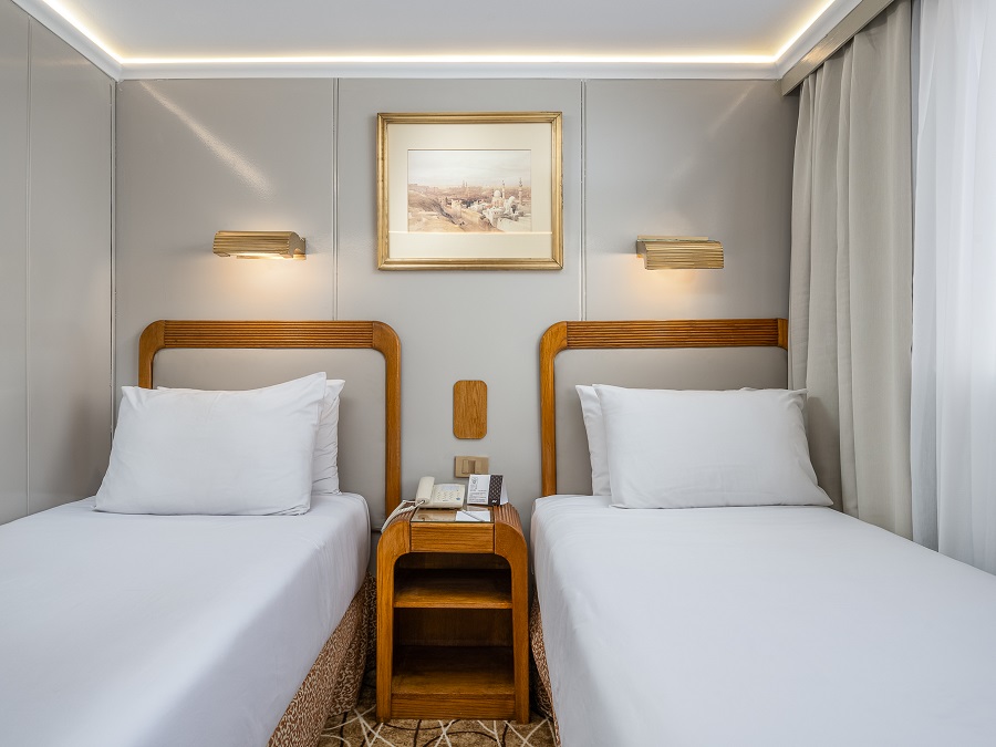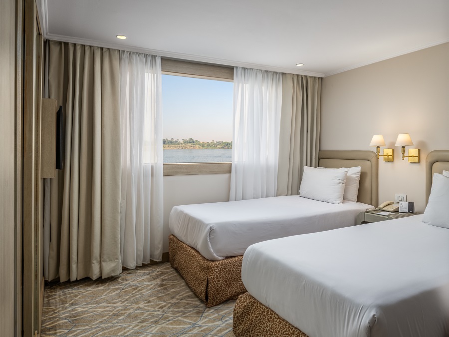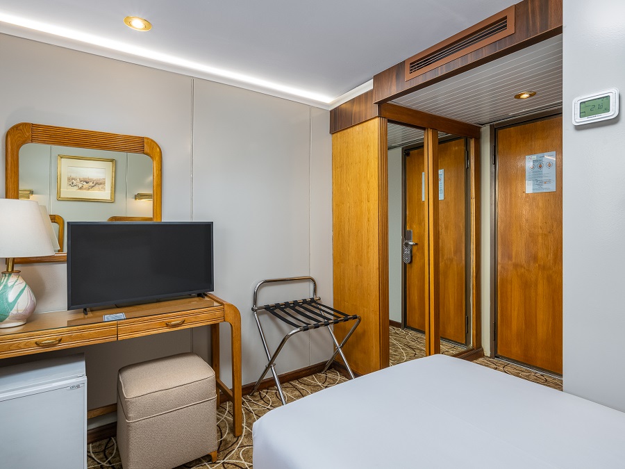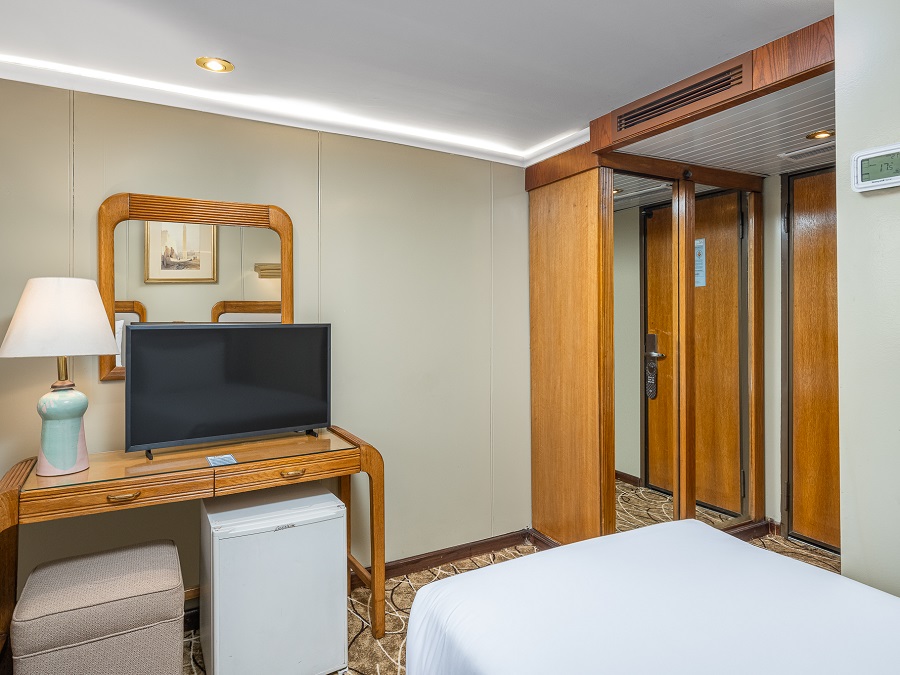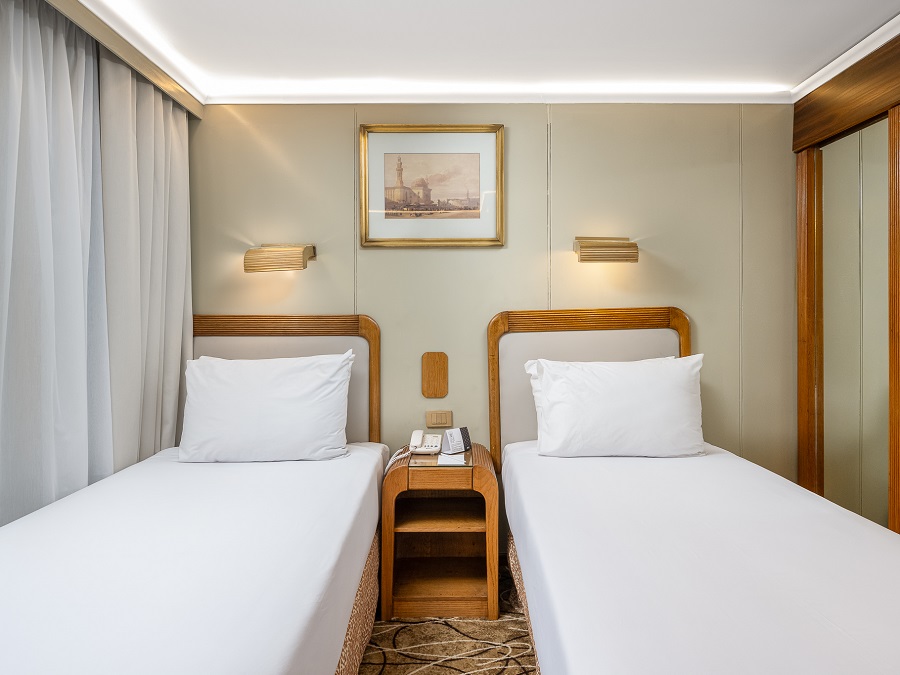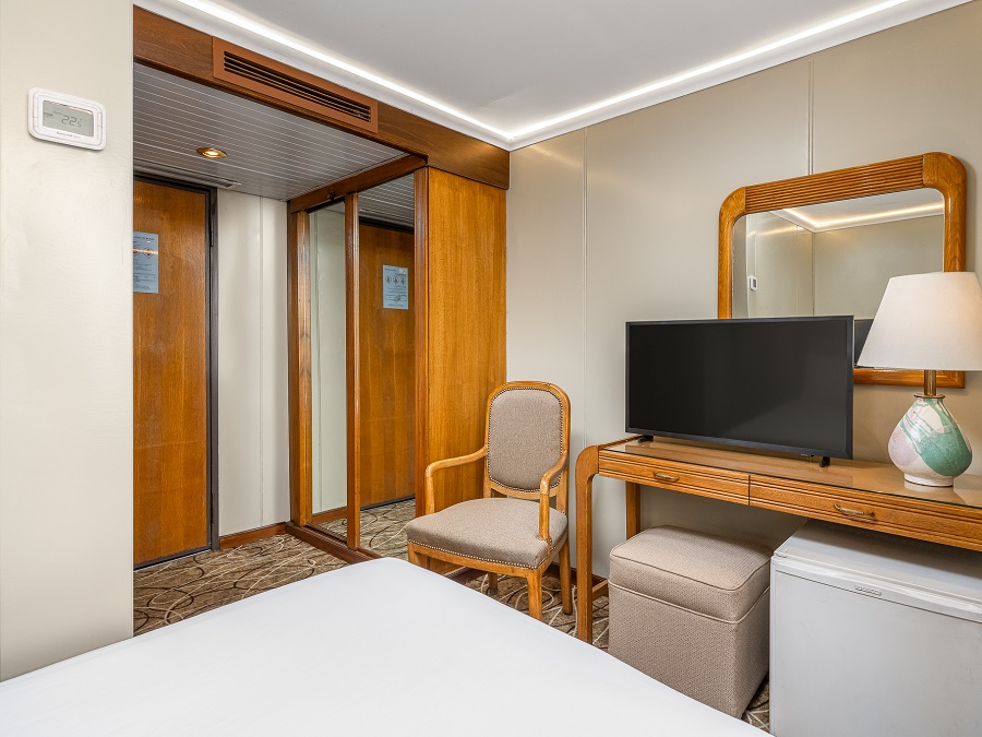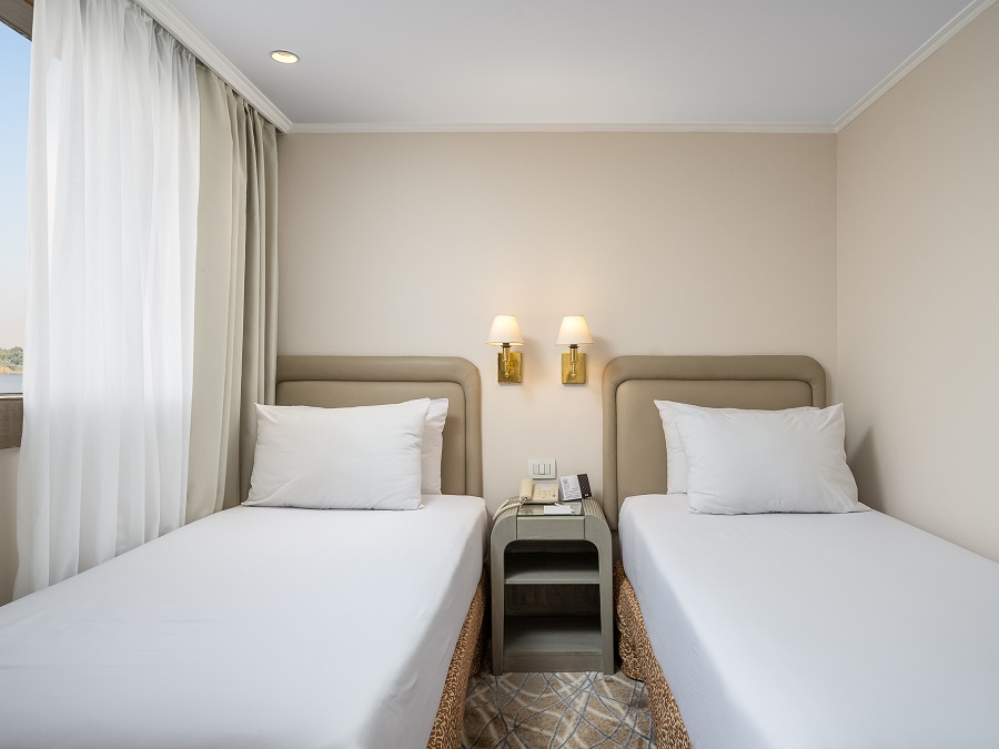| 1 палуба | Twin (type III) К категории Twin (type III) относятся каюты: 101–112, 114, 116, 118.Двухместная каюта со всеми удобствами, расположенная на первой палубе.Площадь каюты ≈ 18 м². Бутилированная вода – ежедневное пополнение (0,5 л/чел). В каюте: две односпальные кровати (при необходимости трансформируются в двуспальную кровать), ванная комната (раковина, душевая кабина, туалет), кондиционер с отдельным блоком управления, спутниковое телевидение, сейф, фен, туалетные принадлежности, мини-бар, питьевая вода, телефон, обзорное окно. | 2-местное размещение | ✔ |