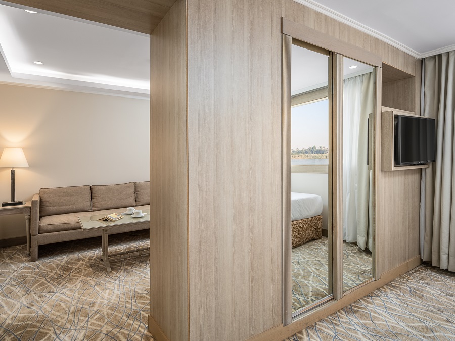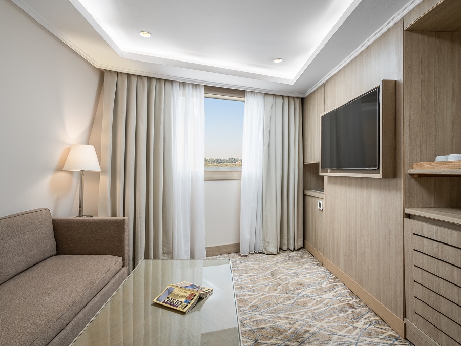 | 2 палуба | Suite К категории Suite относятся каюты: 201, 202.Двухкомнатная двухместная каюта со всеми удобствами, расположенная на второй палубе.Площадь каюты ≈ 28 м². Бутилированная вода – ежедневное пополнение (0,5 л/чел). Возможно размещение третьего человека на дополнительном спальном месте – диван. В каюте: одна двуспальная кровать (при необходимости трансформируется в две односпальные кровати), диван, ванная комната (раковина, душевая кабина, туалет), кондиционер с отдельным блоком управления, спутниковое телевидение, сейф, фен, туалетные принадлежности, мини-бар, питьевая вода, телефон, обзорное окно. | 2-местное размещение | ✔ |