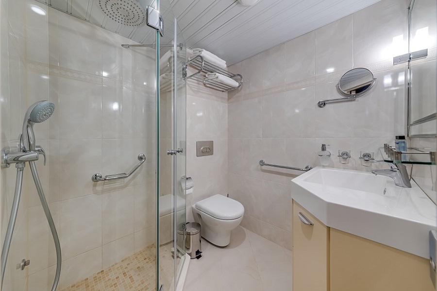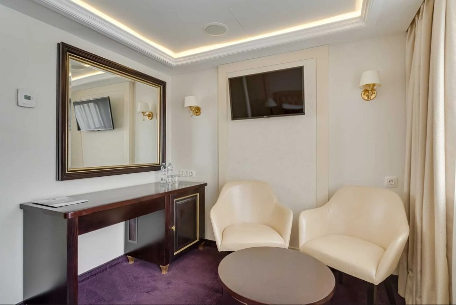 Средняя палуба | Комфорт премиум (средняя палуба) К категории Комфорт премиум (средняя палуба) относятся каюты: 301–304.Двухместная каюта со всеми удобствами, расположенная на средней палубе. Площадь каюты ≈ 13 м². Размер кровати – 160х200 см. Доступ к Wi-Fi предоставляется с ограничением трафика. В каюте: двуспальная кровать (можно раздвинуть), кондиционер/обогреватель, телевизор, сейф, внутренний телефон, фен, холодильник, стеклянные стаканы для питья, щетка для одежды, тапочки, обзорное окно.В ванной комнате: душ, зеркало, 2 стакана, туалетные принадлежности (мыло, шампунь, гель для душа, туалетная бумага), комплект полотенец (полотенце банное большое, полотенце для рук среднее). | 2-местное размещение | ✔ |