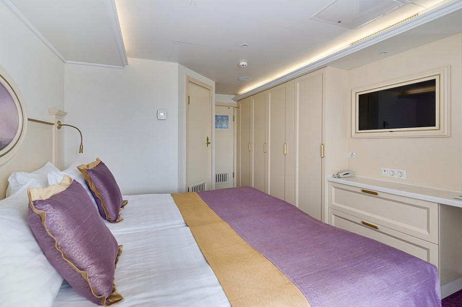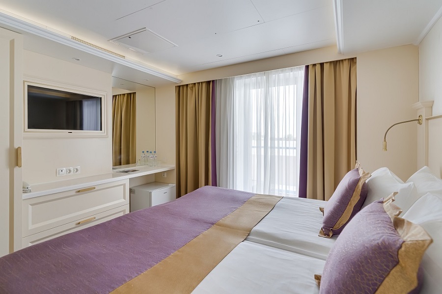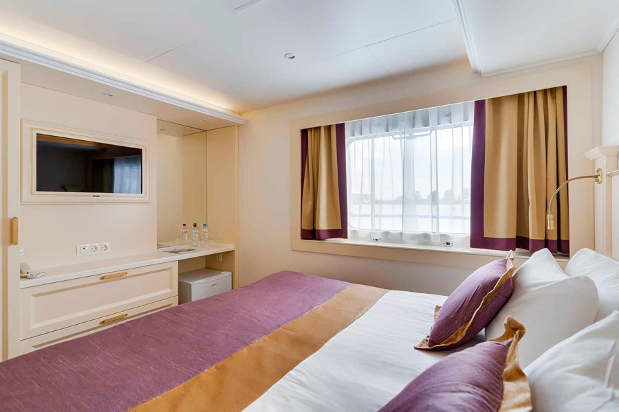 Главная палуба | Комфорт премиум (главная палуба) К категории Комфорт премиум (главная палуба) относятся каюты: 201–224.Двухместная каюта со всеми удобствами, расположенная на главной палубе. Площадь каюты ≈ 13 м². Размер кровати – 160х200 см. Доступ к Wi-Fi предоставляется с ограничением трафика. В каютах 207, 208, 217 и 218 нельзя раздвинуть кровати. В каюте: двуспальная кровать (можно раздвинуть), кондиционер/обогреватель, телевизор, сейф, внутренний телефон, фен, холодильник, стеклянные стаканы для питья, щетка для одежды, тапочки, обзорное окно.В ванной комнате: душ, зеркало, 2 стакана, туалетные принадлежности (мыло, шампунь, гель для душа, туалетная бумага), комплект полотенец (полотенце банное большое, полотенце для рук среднее). | 2-местное размещение | ✔ |