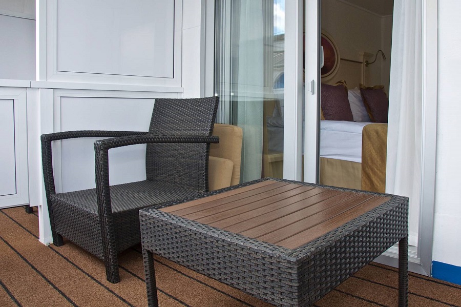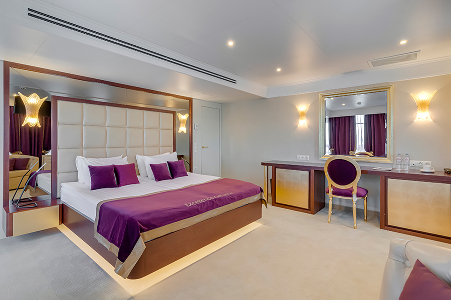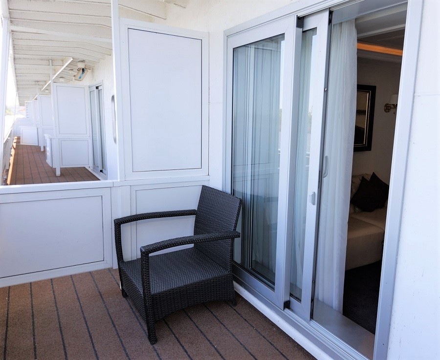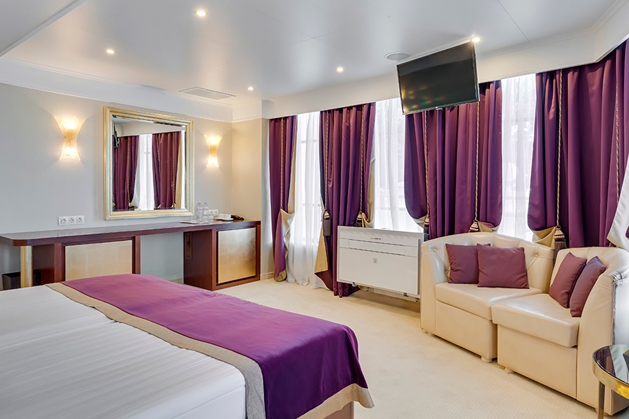 Средняя палуба | Панорамный люкс с балконом К категории Панорамный люкс с балконом относятся каюты: 337, 338.Двухместная каюта с балконом и со всеми удобствами, расположенная на средней палубе. Площадь каюты ≈ 30 м². Площадь балкона ≈ 24 м². Размер кровати – 160х200 см. Доступ к Wi-Fi предоставляется без ограничения трафика. Возможно размещение третьего человека (ребенок до 14 лет включительно) на дополнительном спальном месте – еврораскладушка. В каюте: двуспальная кровать (не раздвигается), кондиционер/обогреватель, телевизор, сейф, внутренний телефон, фен, холодильник, капсульная кофемашина (по одной капсуле кофе ежедневно на основное место), набор посуды (тарелки, вилки, ножи, стаканы для воды, винные бокалы, чайная пара), щетка для одежды, тапочки, халат банный, салфетки в коробке, фирменные ручка и блокнот, панорамное остекление и выход на индивидуальный балкон.В ванной комнате: душ, зеркало, 2 стакана, туалетные принадлежности (мыло, шампунь, гель для душа, туалетная бумага), комплект полотенец (полотенце банное большое, полотенце для рук среднее, полотенце для ног). | 2-местное размещение | нет |
