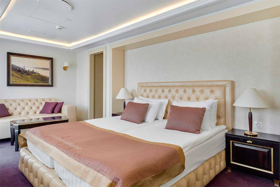 Шлюпочная палуба | Люкс+ с балконом К категории Люкс+ с балконом относятся каюты: 419–426.Двухместная каюта с балконом и со всеми удобствами, расположенная на шлюпочной палубе. Площадь каюты ≈ 30 м². Площадь балкона ≈ 20 м². Размер кровати – 160х200 см. Доступ к Wi-Fi предоставляется без ограничения трафика. Возможно размещение третьего человека (ребенок до 14 лет включительно) на дополнительном спальном месте – еврораскладушка. В каюте: двуспальная кровать (не раздвигается), кондиционер/обогреватель, телевизор, сейф, внутренний телефон, фен, холодильник, капсульная кофемашина (по одной капсуле кофе ежедневно на основное место), набор посуды (тарелки, вилки, ножи, стаканы для воды, винные бокалы, чайная пара), щетка для одежды, тапочки, салфетки в коробке, фирменные ручка и блокнот, оконно-дверной блок с выходом на индивидуальный балкон.В ванной комнате: душ, зеркало, 2 стакана, туалетные принадлежности (мыло, шампунь, гель для душа, туалетная бумага), комплект полотенец (полотенце банное большое, полотенце для рук среднее), халат банный, полотенце для ног. | 2-местное размещение | ✔ |