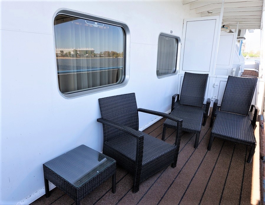 Шлюпочная палуба | Делюкс+ К категории Делюкс+ относятся каюты: 427, 428.Двухместная каюта с балконом и со всеми удобствами, расположенная на шлюпочной палубе.Площадь каюты ≈ 18,6 м². Площадь балкона ≈ 10 м². Размер кровати – 160х200 см. Доступ к Wi-Fi предоставляется без ограничения трафика. Возможно размещение третьего человека (ребенок до 14 лет включительно) на дополнительном спальном месте – еврораскладушка. В каюте: двуспальная кровать (не раздвигается), кондиционер/обогреватель, телевизор, сейф, внутренний телефон, фен, холодильник, капсульная кофемашина (по одной капсуле кофе ежедневно на основное место), набор посуды (тарелки, вилки, ножи, стаканы для воды, винные бокалы, чайная пара), щетка для одежды, тапочки, салфетки в коробке, фирменные ручка и блокнот, оконно-дверной блок с выходом на индивидуальный балкон.В ванной комнате: душ, зеркало, два стакана, туалетные принадлежности (мыло, шампунь, гель для душа, туалетная бумага), комплект полотенец (полотенце банное большое, полотенце для рук среднее), халат банный, полотенце для ног. | 2-местное размещение | нет |