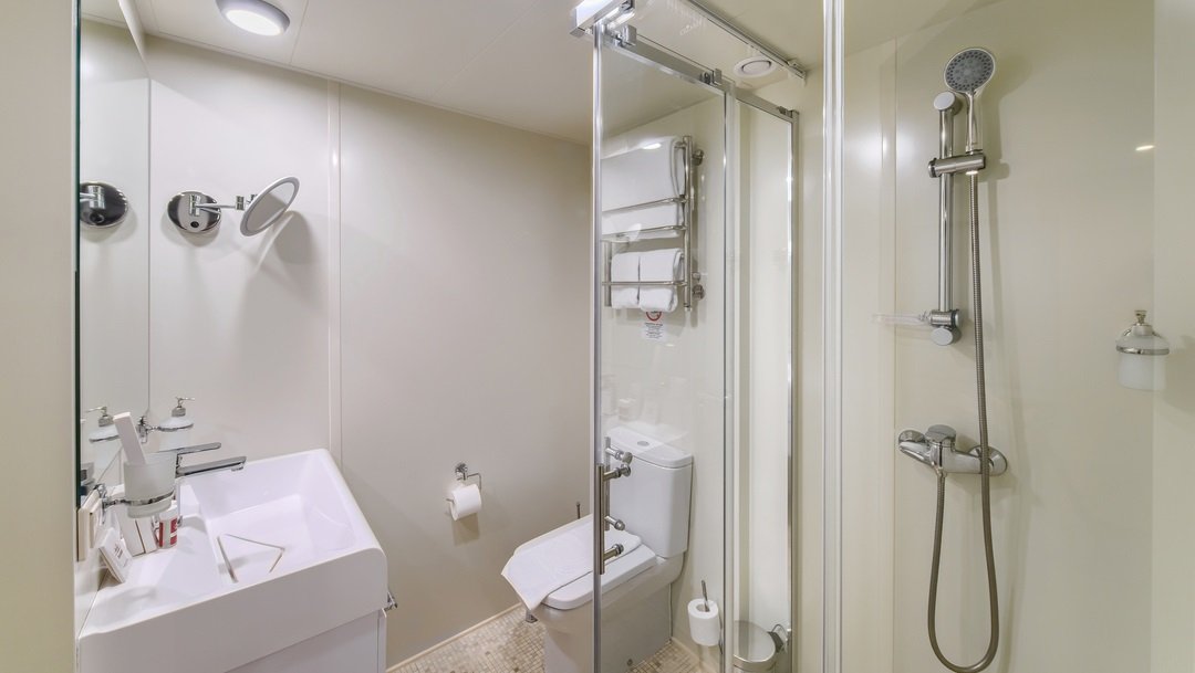 | Средняя палуба | Двухместная одноярусная Однокомнатная одноярусная каюта с удобствами, рассчитанная на размещение двух человек В каюте: двуспальная либо две односпальные кровати, холодильник, телевизор, шкаф для одежды, радио, сейф, обзорное окно, душ, санузел, кондиционер, фен, электророзетка на 220V.В каютах 401, 402, 404, 410, 411, 431-434 (шлюпочная палуба), 319-322, 339, 340, 345, 346, 365, 366, 369, 370 (средняя палуба) — две односпальные кровати размером 80х180 см, площадь каюты 10 м2 | 2-местное размещение | нет |