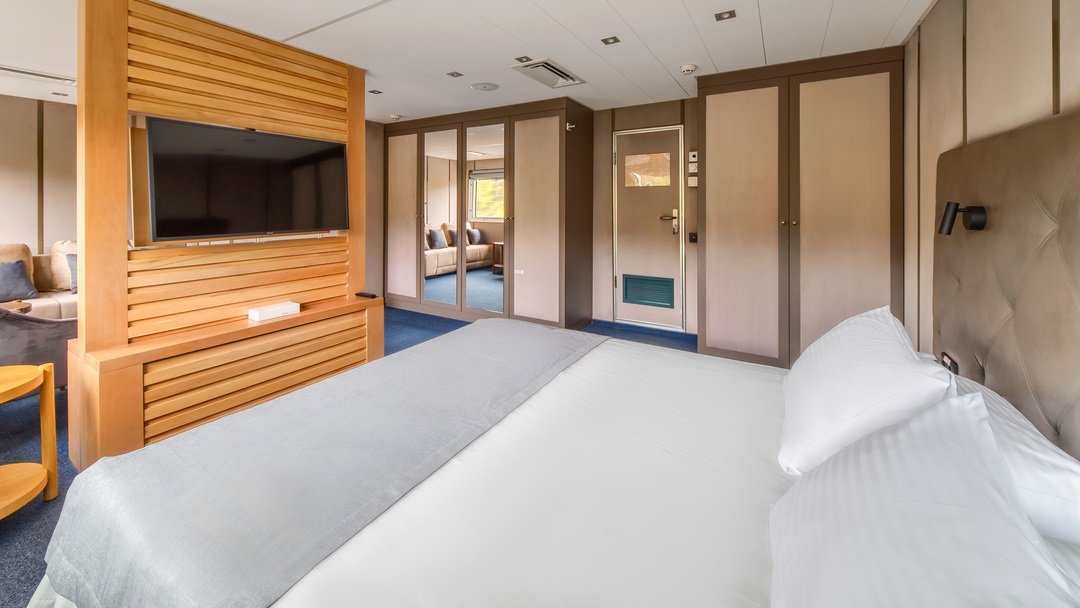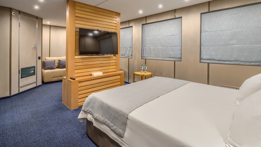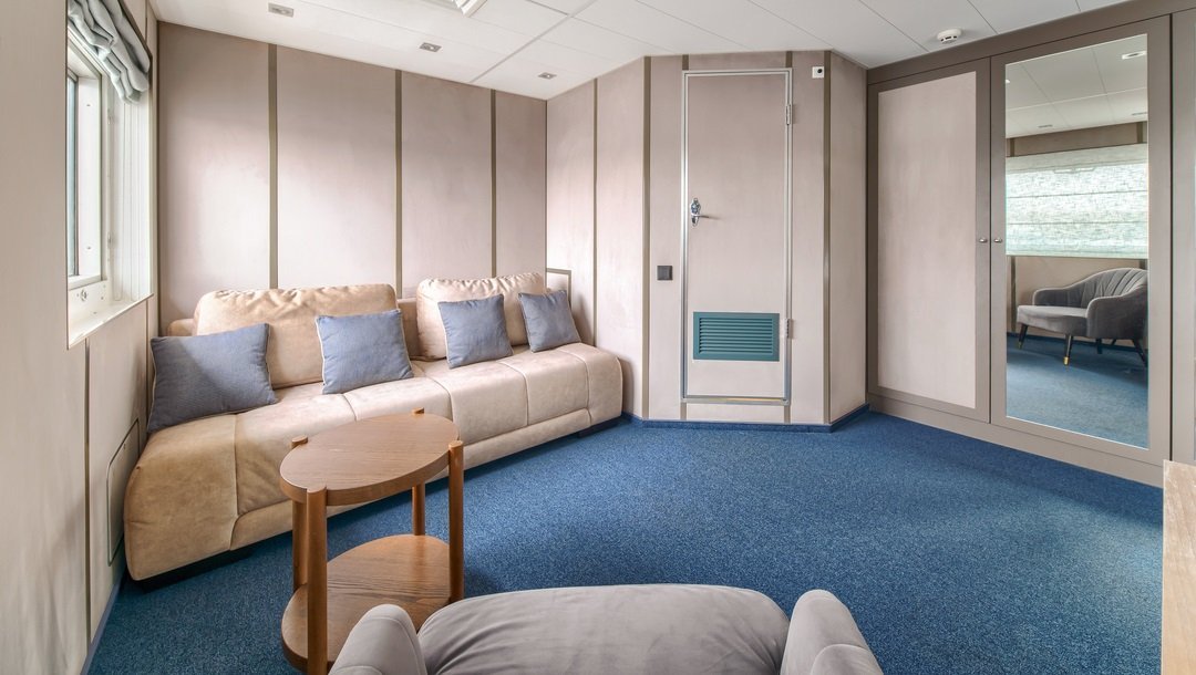 | Средняя палуба | Люкс Однокомнатная каюта с удобствами, рассчитанная на размещение до четырех человек В каюте: двуспальная кровать, диван, кресло, шкаф для одежды, журнальный стол, телевизор, холодильник, фен, радио, сейф, четыре обзорных окна, электророзетка на 220V.Площадь кают 301-304 — 28,4 м2, 359-360 — 26 м2Размер кроватей 160х200 смРазмер дивана в разложенном состоянии: 140х200 смПо запросу возможно поставить детскую кроватку. | 2-местное размещение | нет |