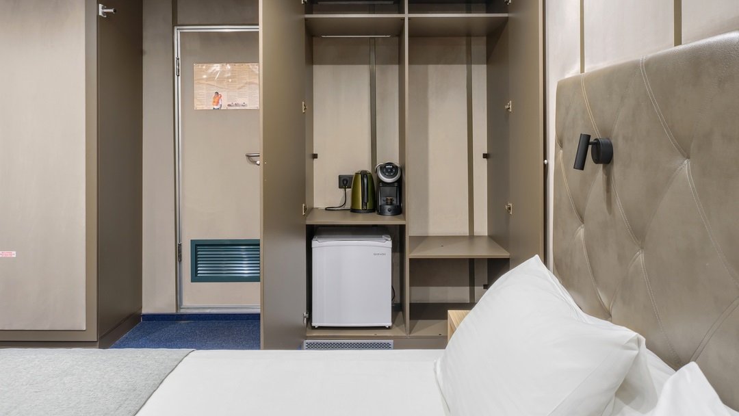 | Главная палуба | Делюкс Однокомнатная каюта с удобствами, рассчитанная на размещение двух человек В каюте: двуспальная кровать, либо две односпальные, кресло, шкаф для одежды, пуфик, телевизор, холодильник, радио, сейф, обзорное окно, душ, санузел, кондиционер, фен, электророзетка на 220V.В каютах 403, 405-409, 412, 414, 419-422 (шлюпочная палуба), 323-334, 341-344 (средняя палуба) — двуспальная кровать размером 160х200 см, площадь каюты 15,5 м2В каютах 201-224 (главная палуба) — две односпальные кровати размером 80х185 см, площадь каюты 13,2 м2.Поставить детскую кроватку по запросу возможно только в каютах на главной палубе. | 2-местное размещение | нет |