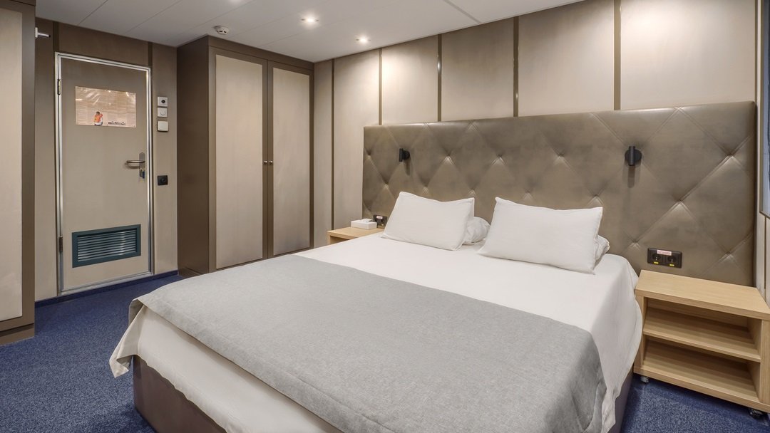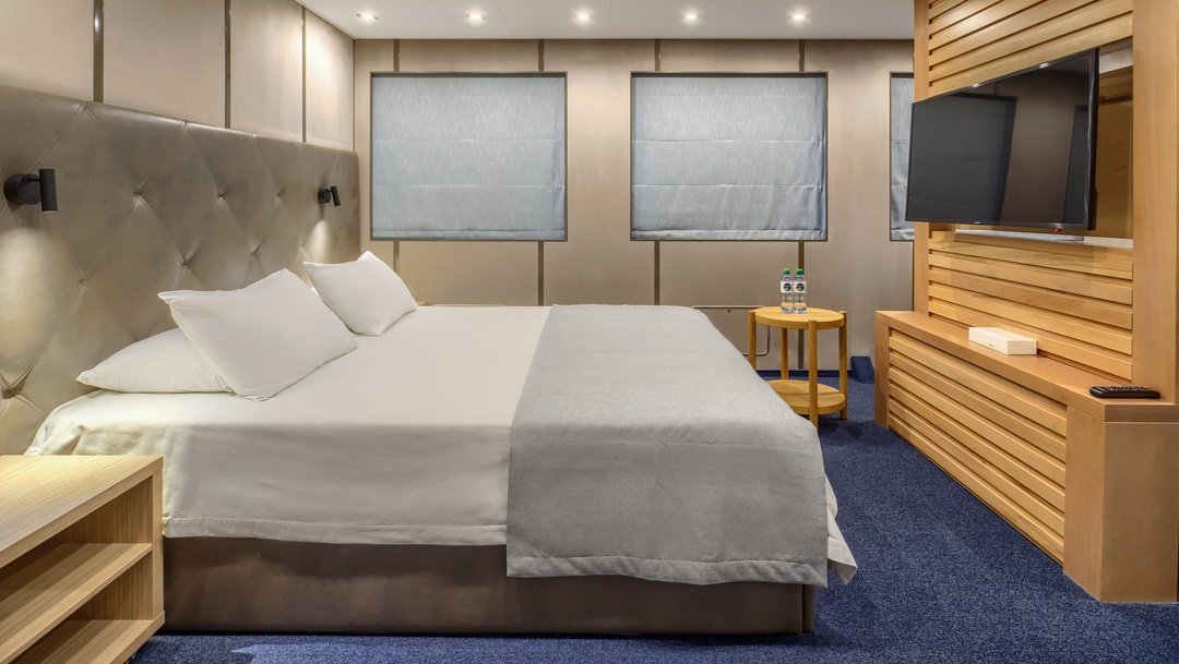 | Средняя палуба | 2-местная с двуспальной кроватью Однокомнатная каюта с удобствами, рассчитанная на размещение двух человек В каюте: двуспальная кровать, холодильник, телевизор, шкаф для одежды, радио, сейф, обзорное окно, душ, санузел, кондиционер, фен, электророзетка на 220V.В каютах 413, 415-418 (шлюпочная палуба), 335-338 (средняя палуба) — двуспальная кровать размером 160х200 см, площадь каюты 10 м2 | 2-местное размещение | нет |