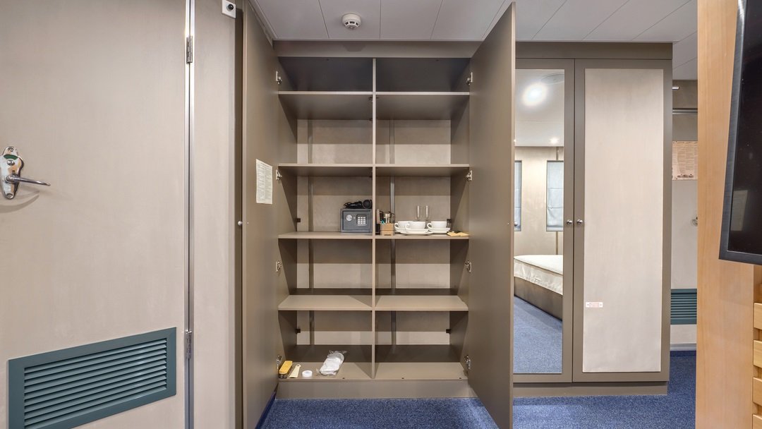 | Средняя палуба | Двухместная одноярусная Однокомнатная одноярусная каюта с удобствами, рассчитанная на размещение двух человек В каюте: двуспальная либо две односпальные кровати, холодильник, телевизор, шкаф для одежды, радио, сейф, обзорное окно, душ, санузел, кондиционер, фен, электророзетка на 220V.В каютах 401, 402, 404, 410, 411, 431-434 (шлюпочная палуба), 319-322, 339, 340, 345, 346, 365, 366, 369, 370 (средняя палуба) — две односпальные кровати размером 80х180 см, площадь каюты 10 м2 | 1-местное размещение | нет |