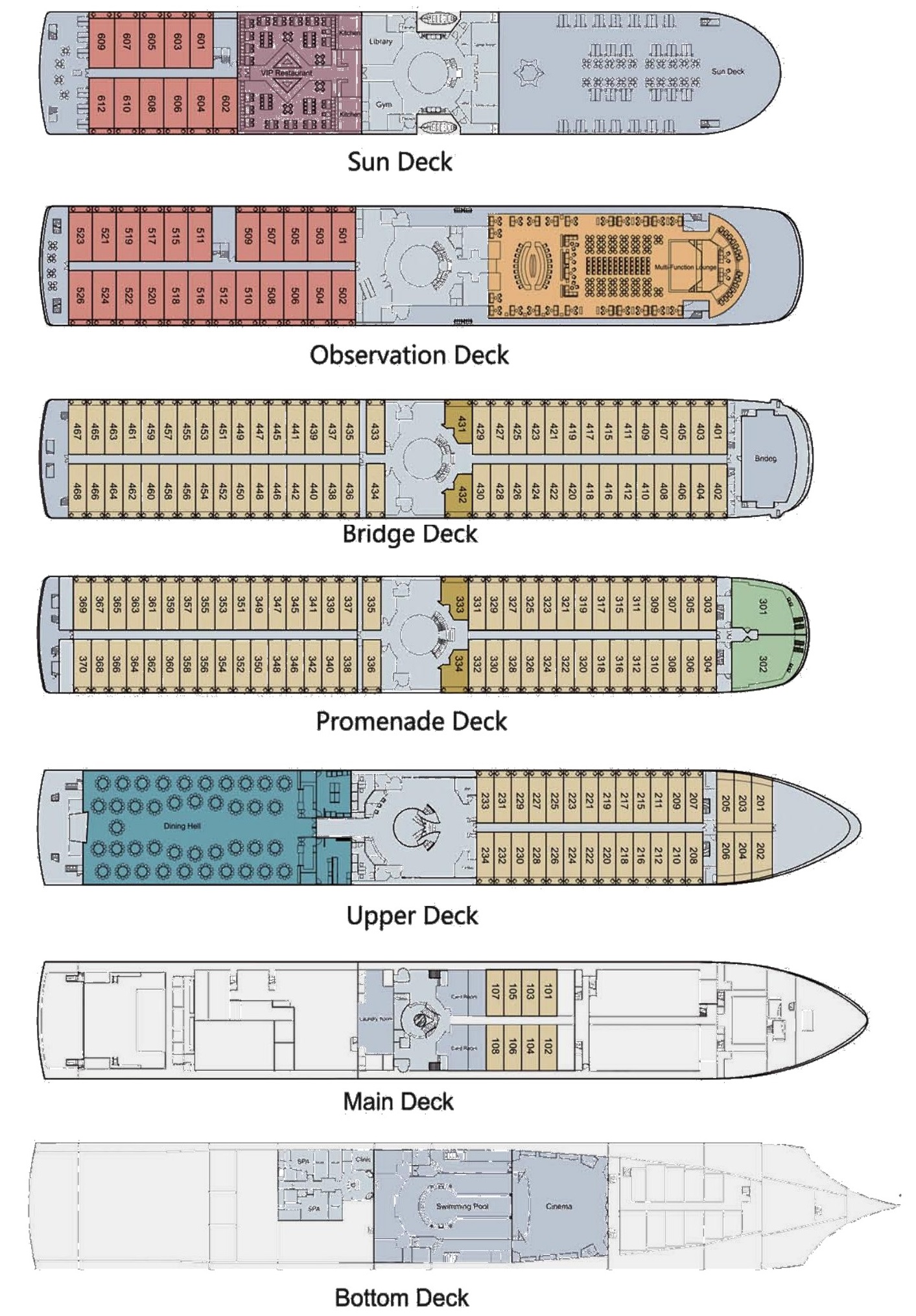 Deck 2 (upper deck) | Делюкс с балконом (Палуба 2) Двухместная каюта со всеми удобствами, расположенная на второй палубе.Площадь каюты от 28 до 30 м². Площадь балкона ≈ 2,8 м². Размер кровати 2,0х0,9 м (не трансформируются). Бутилированная вода доставляется в каюту ежедневно. В каюте: две односпальные кровати, ванная комната (раковина, душевая кабина, туалет), система кондиционирования воздуха, спутниковое телевидение, питьевая вода (ежедневно), чайник и чайный набор, туалетные принадлежности, стеклянная балконная дверь-окно, персональный балкон с мебелью для отдыха. | 2-местное размещение | ✔ |