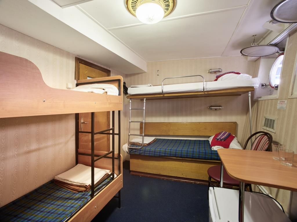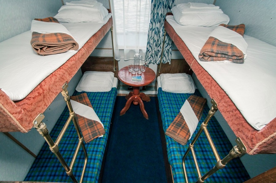 Нижняя палуба | 3 класс К категории 3 класс относятся каюты: 130, 136, 138, 140, 142, 144, 146Четырехместная двухъярусная каюта, расположенная на нижней палубе.Площадь каюты ≈ 5,5 м². Душ и туалет на палубе. В каюте: две двухъярусные кровати, столик, крючки для одежды, радио, розетка, иллюминатор. | 4-местное размещение | ✔ |