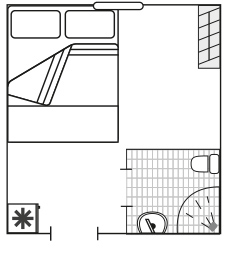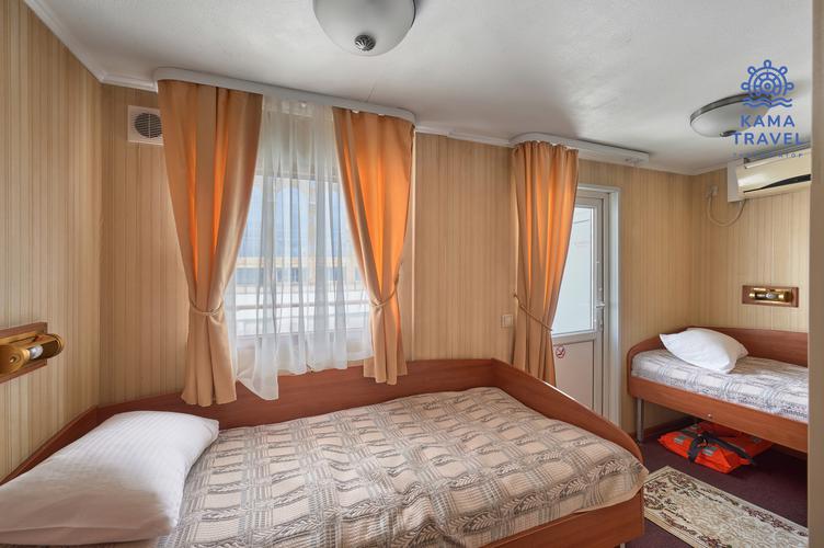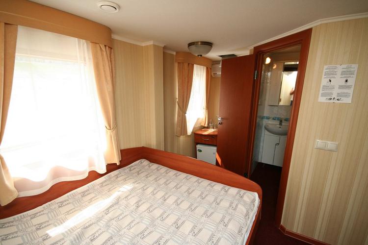 Средняя палуба | Комфорт (двуспальная кровать) К категории Комфорт (двуспальная кровать) относятся каюты: 313, 315.Двухместная каюта со всеми удобствами, расположенная на средней палубе. Площадь каюты ≈ 12,2 м².В каюте: двуспальная кровать, ванная комната (раковина, душ, туалет), холодильник, графин, шкаф для одежды, система кондиционирования, радио, розетка, обзорные окна. | 2-местное размещение | ✔ |