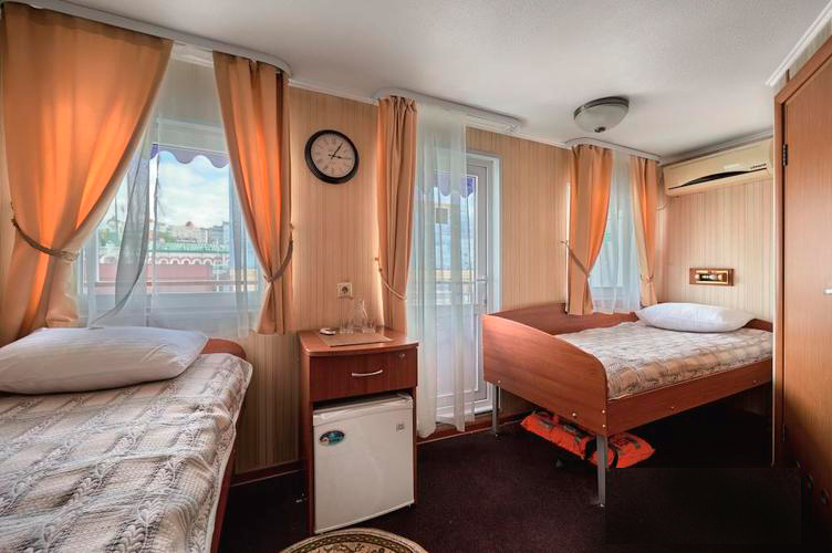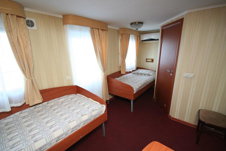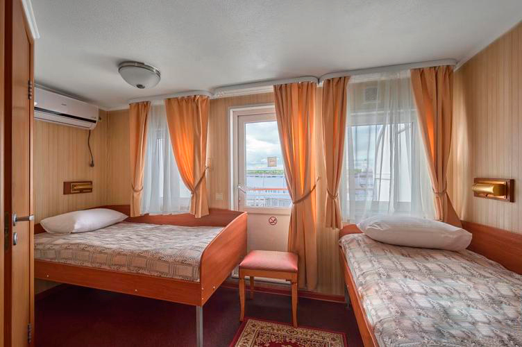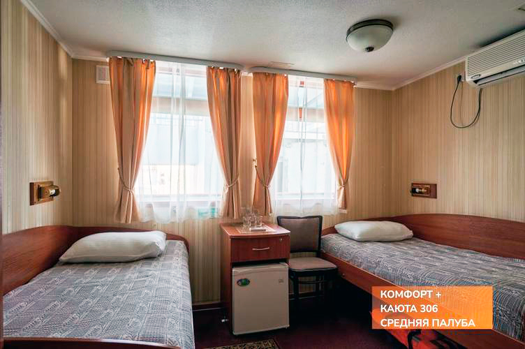 Средняя палуба | Комфорт К категории Комфорт относятся каюты: 301–312, 314, 316–320.Двухместная каюта со всеми удобствами, расположенная на средней палубе.Площадь каюты ≈ 10,2 м².В каюте: две односпальные кровати, ванная комната (раковина, душ, туалет), холодильник, шкаф для одежды, графин, система кондиционирования, радио, розетка, обзорные окна. | 2-местное размещение | ✔ |
