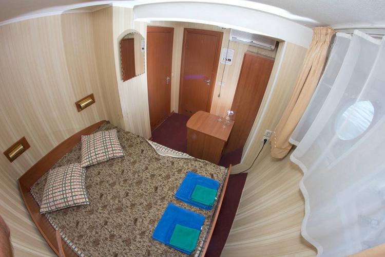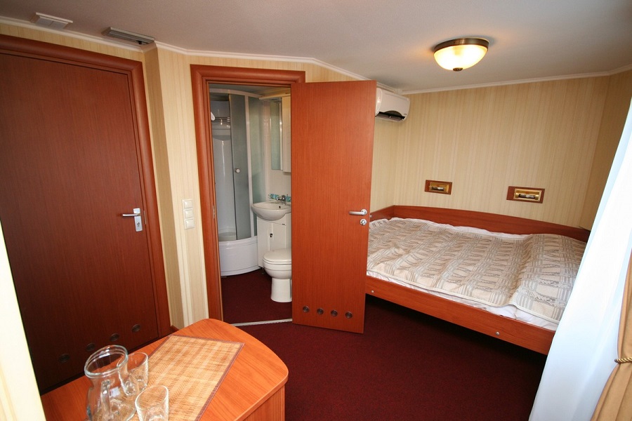 Нижняя палуба | Стандарт А (двуспальная кровать) К категории Стандарт A (двуспальная кровать) отностятся каюты: 101, 102.Двухместная каюта со всеми удобствами, расположенная на нижней палубе.Площадь каюты от 8,2 до 8,9 м².В каюте: двуспальная кровать, ванная комната (раковина, душ, туалет), холодильник, графин, шкаф для одежды, система кондиционирования, радио, розетка, иллюминаторы. | 2-местное размещение | ✔ |